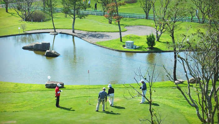 クラブでボールを打ち、カップインするまでの打数を競い合い楽しく遊べる健康的なスポーツです