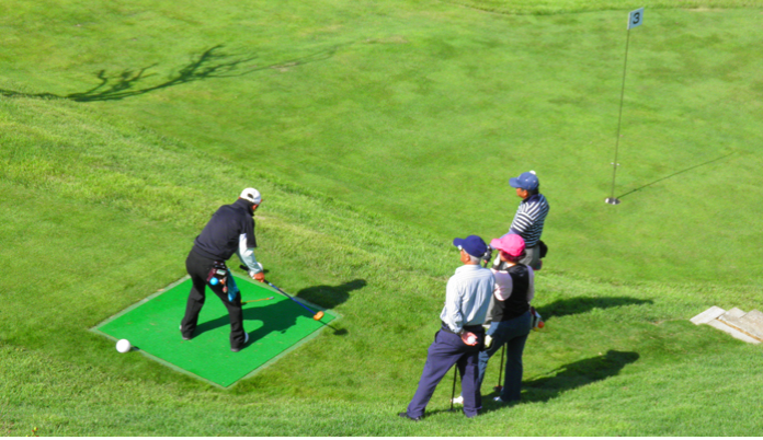 スタート位置にティーグラウンドがあり、1ホールに3から5の標準打数(パー)が設定されています