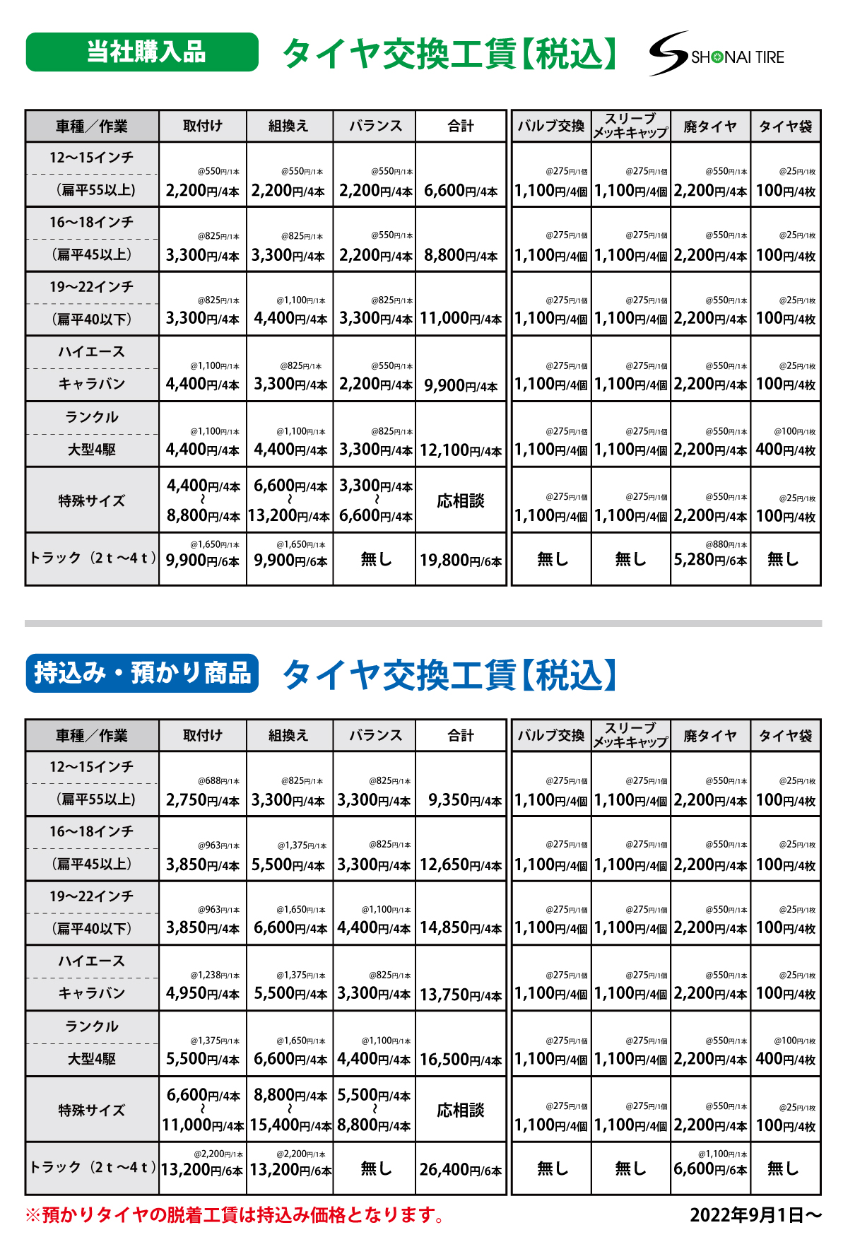☆庄内タイヤで商品をご予約しているお客様専用のご予約サイトです☆ ①翌日以降のタイヤ交換予約を承っております。なお、 翌日の予約受付は今日の15:00までになります。当日のタイヤ交換や15:00以降の翌日のタイヤ交換のご希望は「0234-23-1597」庄内タイヤ酒田店まで直接お問い合わせください。 ②当日の混雑状況により、作業時間が多少前後する場合がございます。 ③ご予約時間を30分以上過ぎた場合、ご予約を自動的にキャンセルさせていただきます。 作業代金は、下記の工賃表をご参照ください。