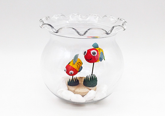染色したまゆ玉を使って、かわいらしい黄ぶな(宇都宮の伝承の生き物)の置物を作ります。