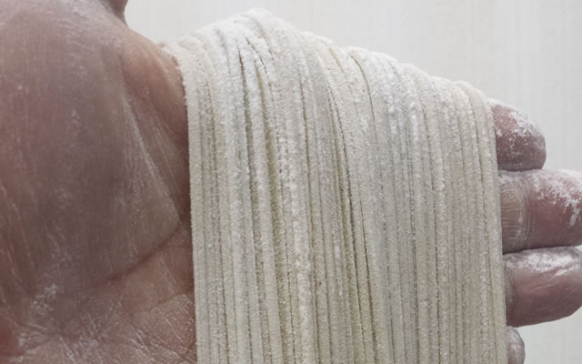 打ったそばは、茹がいてお召し上がりいただけます。(持ち帰りもOK)