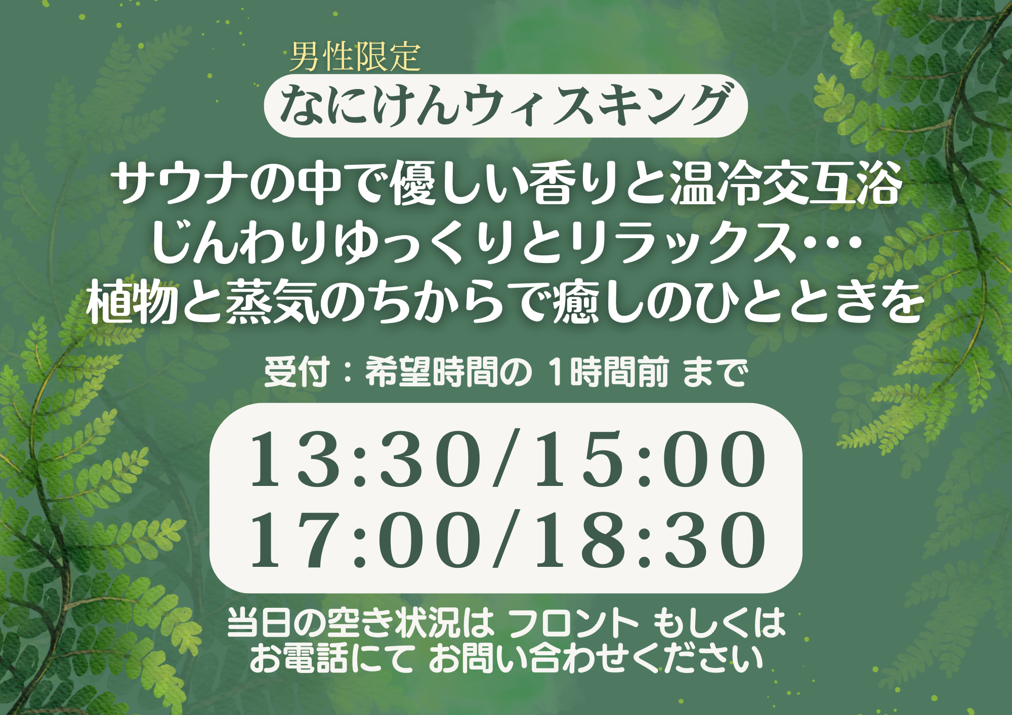 当日予約・ご質問は、お電話またはフロントでご確認くださいませ。
