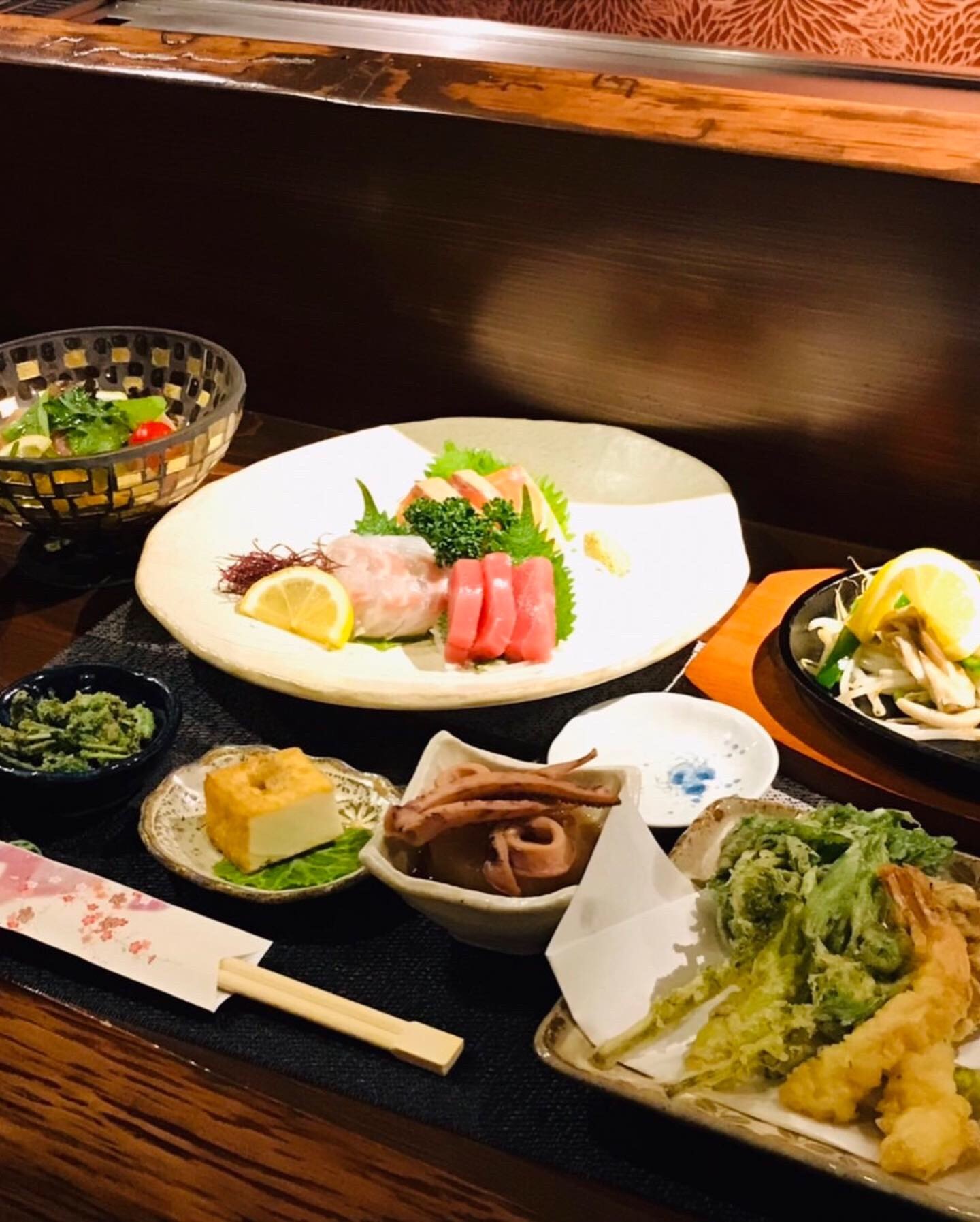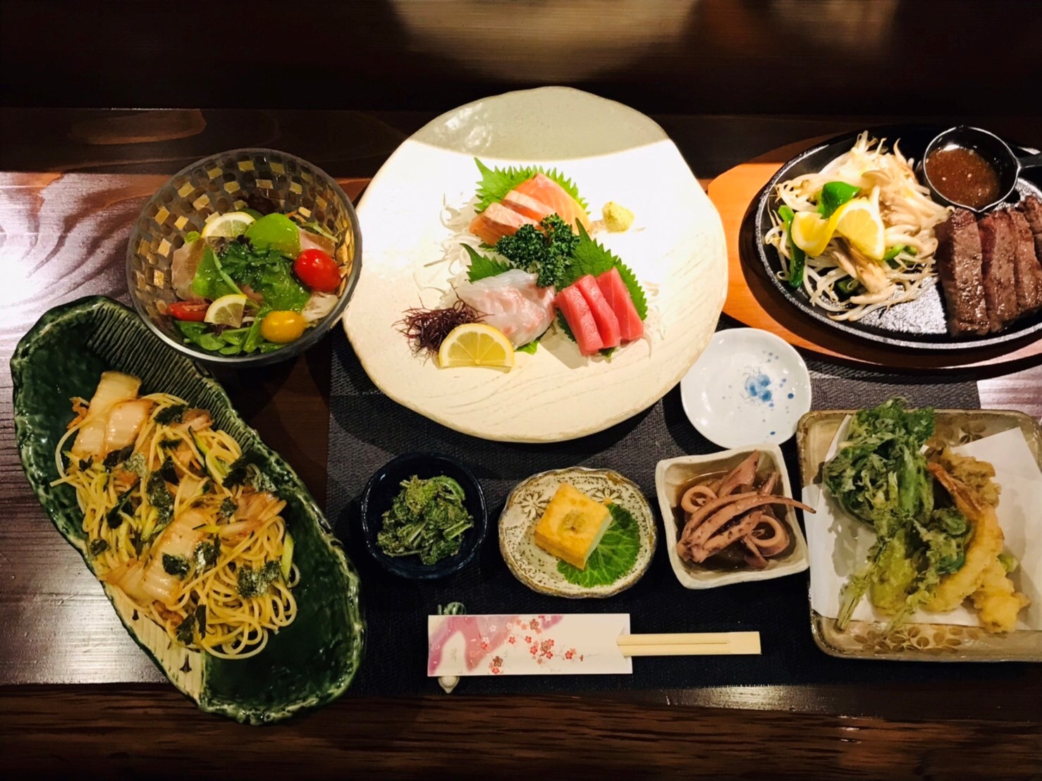 お通し三品・小鍋・焼き魚・肉料理・刺身盛り
