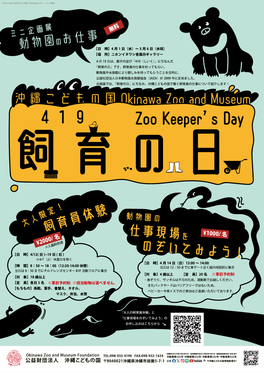 4月19日は「419(しいく)」の数字にちなんだ「飼育の日」です。 飼育員の仕事内容を知り動物園・水族館に興味を持ってもらうことを目的として公益社団法人日本動物園水族館協会(JAZA)が2009年に定めました。沖縄こどもの国では、「大人の飼育体験」「動物園の仕事の現場をのぞいてみよう!」など動物園の飼育員の仕事を学び、体験できるイベントをおこないます。