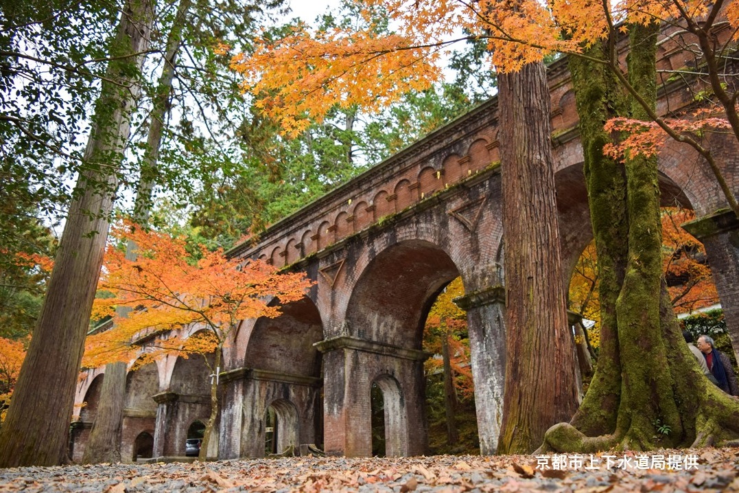 このコースでは、錦秋の景色を愛でつつ、南禅寺境内に残るレンガ造の水道橋「水路閣」、傾斜鉄道「インクライン」などを見学しながら、蹴上(けあげ)付近の疏水関連施設をめぐります。