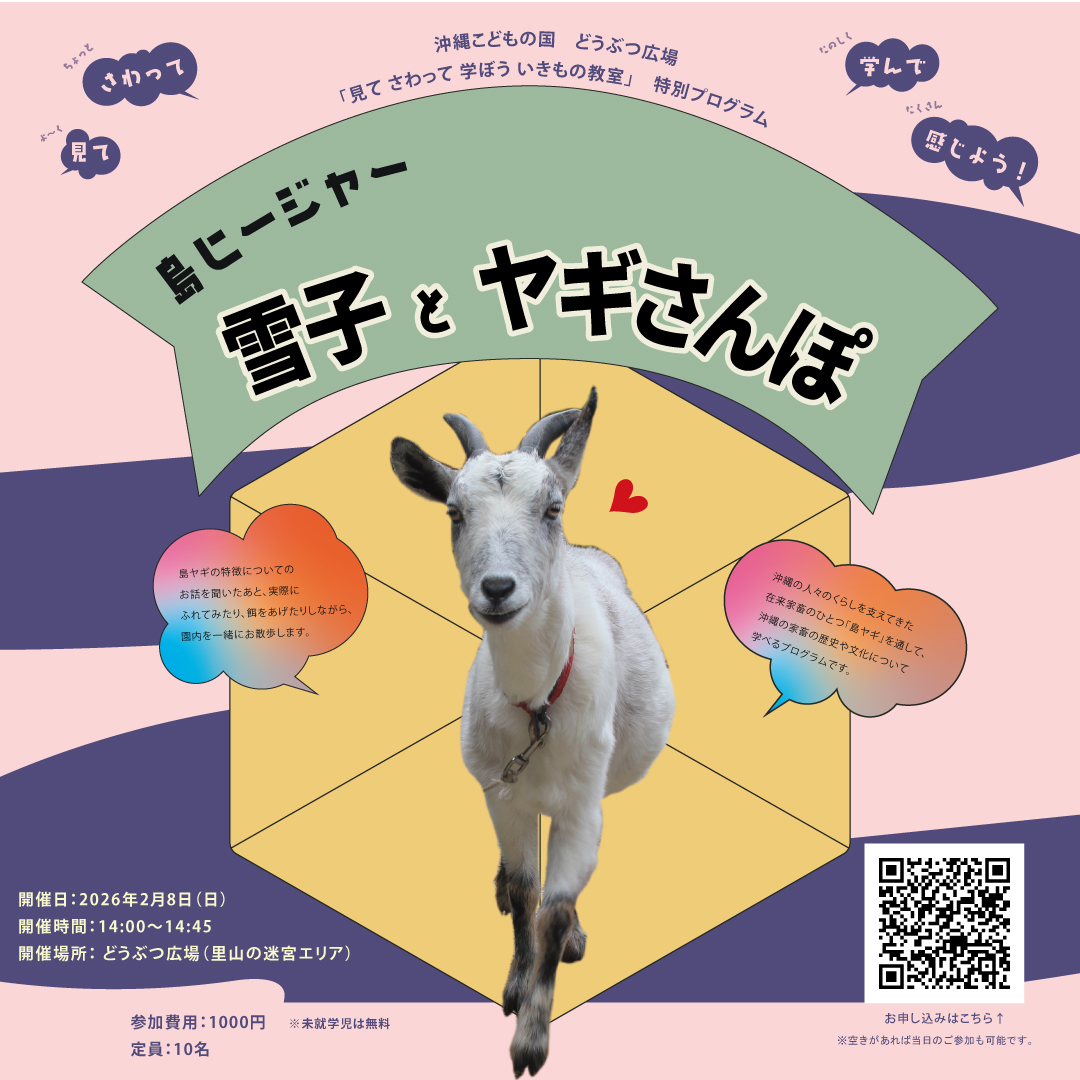 島ヤギの特徴についてのお話を聞いたあと、実際にふれてみたり、餌をあげたりしながら、園内を一緒にお散歩します。沖縄の人々のくらしを支えてきた在来家畜のひとつ「島ヤギ」を通して、沖縄の家畜の歴史や文化について学べるプログラムです。