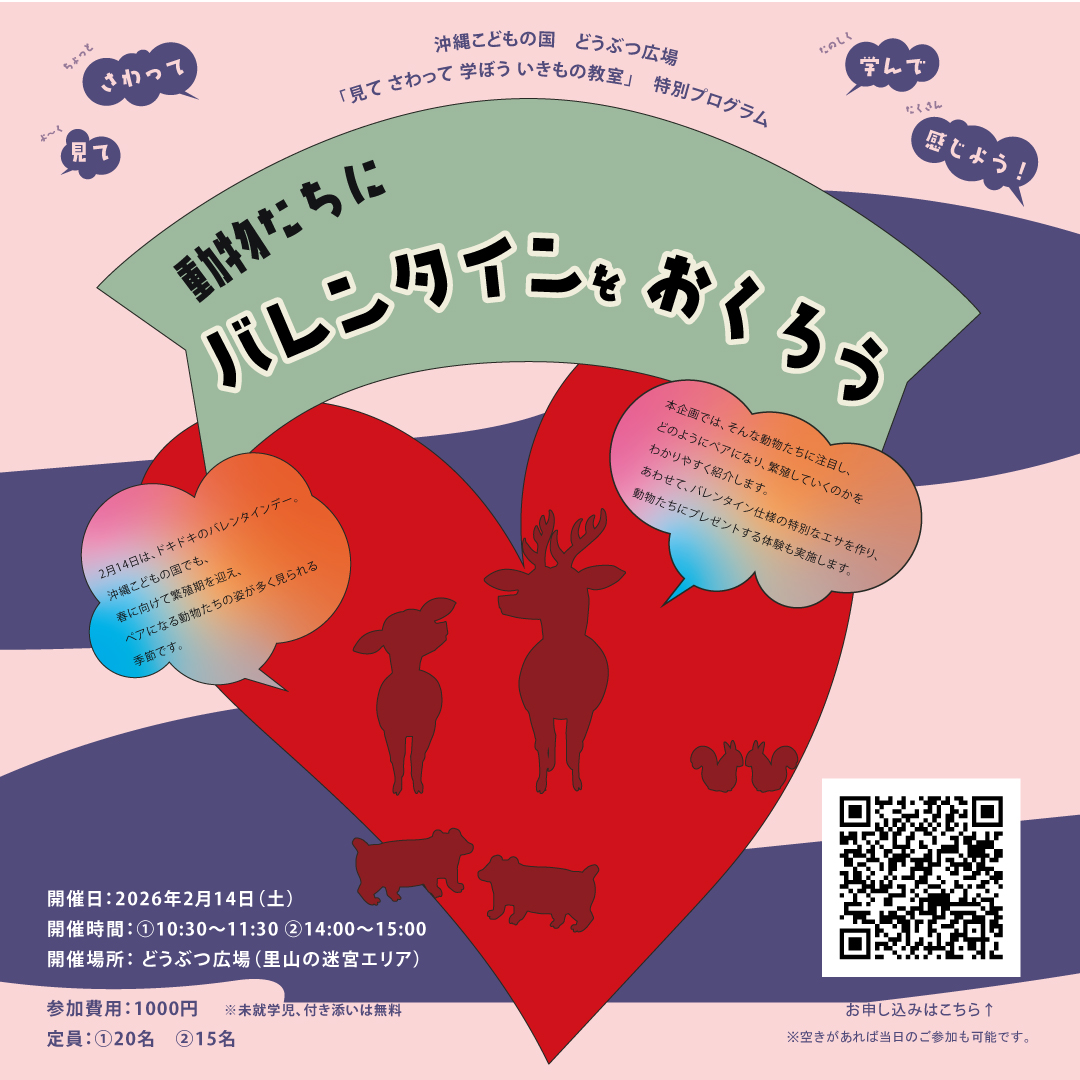 2月14日は、ドキドキのバレンタインデー。沖縄こどもの国でも、春に向けて繁殖期を迎え、ペアになる動物たちの姿が多く見られる季節です。本企画では、そんな動物たちに注目し、どのようにペアになり、繁殖していくのかをわかりやすく紹介します。あわせて、バレンタイン仕様の特別なエサを作り、動物たちにプレゼントする体験も実施します。