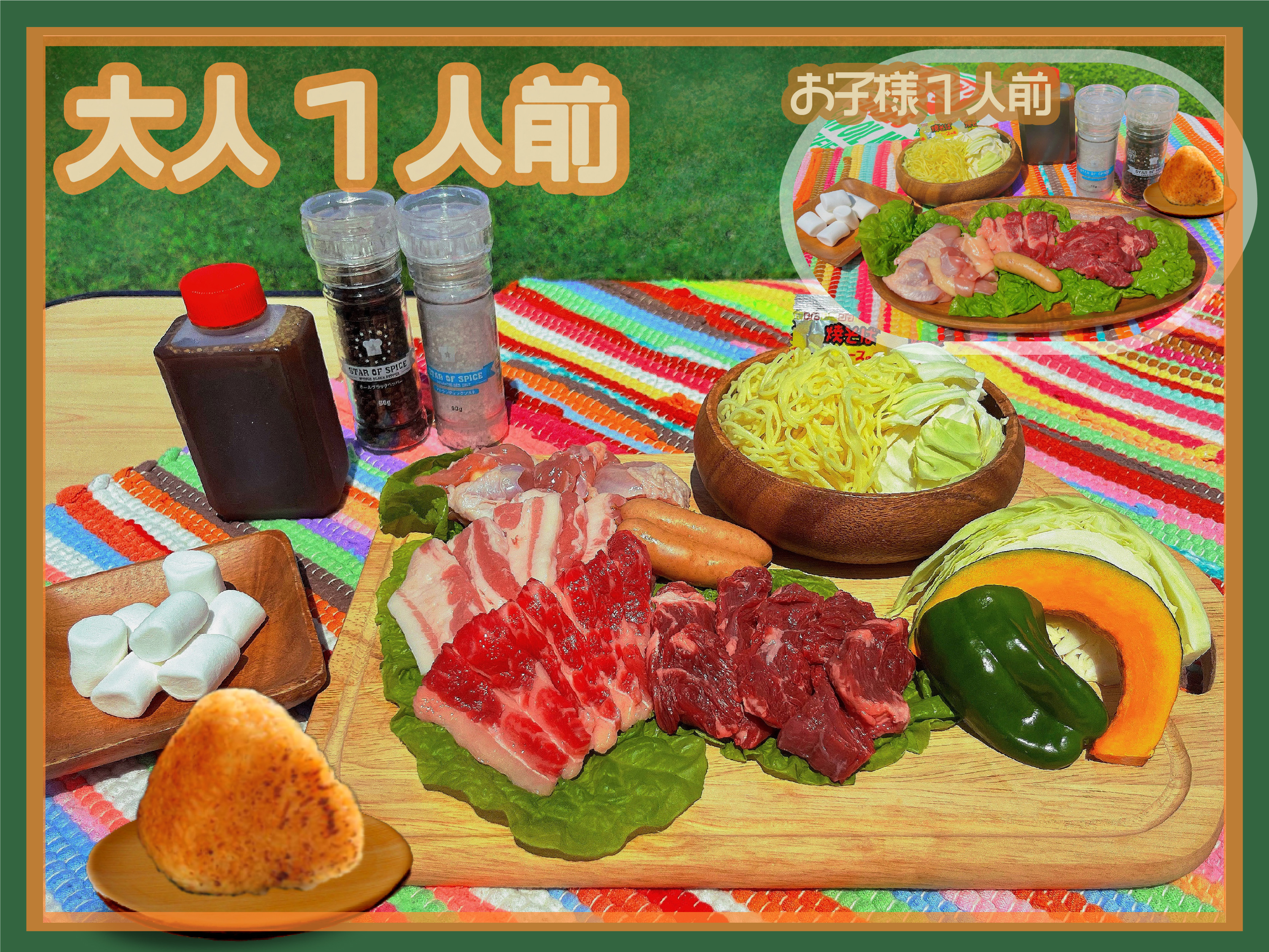 牛ハラミ50g、豚バラ50g、若鶏50g、フランクフルト1本、焼きそば(半玉)、焼き野菜(2種)、マシュマロ(適量)、焼肉のタレ、塩コショウ