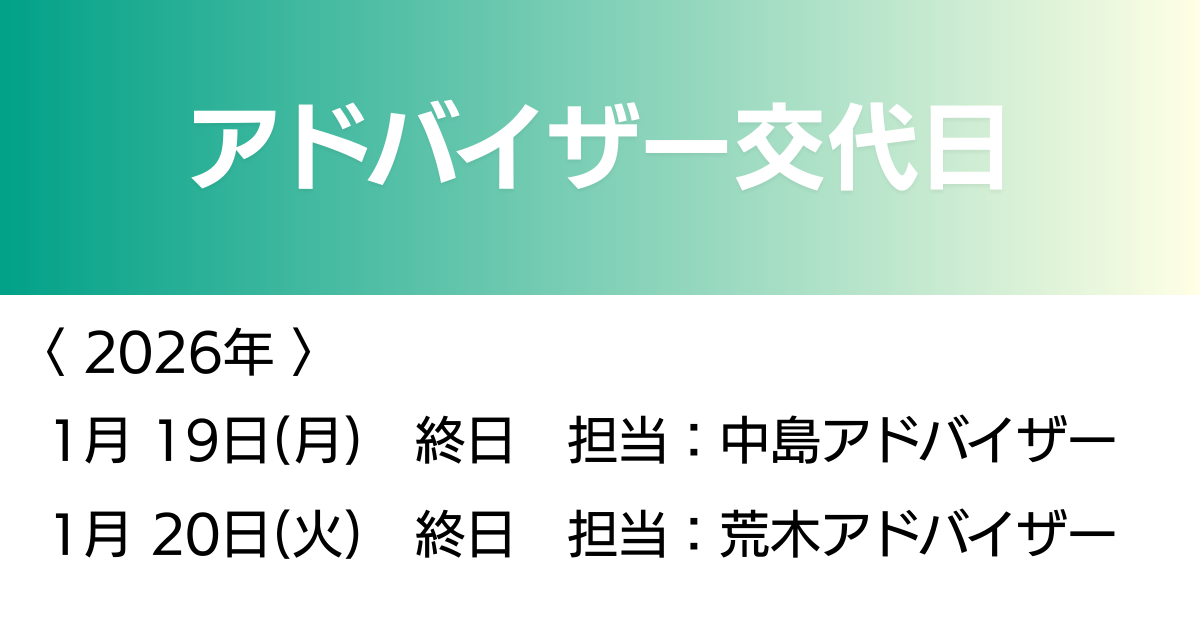 ①ご希望の日程をお選びください。 ※当日をご希望の場合はお電話にて空き状況をお問い合わせください。 ②必須項目を入力して仮予約を完了してください。 ③当センターから予約確定の連絡が届きましたら予約確定です。 《アドバイザー紹介はこちら》 月曜担当:丸山アドバイザー 火曜担当:中島アドバイザー 水曜担当:長山アドバイザー 木曜担当:荒木アドバイザー 金曜担当:星野チーフアドバイザー アドバイザーの担当曜日であっても、都合により代理のアドバイザーに交代となる場合があります。