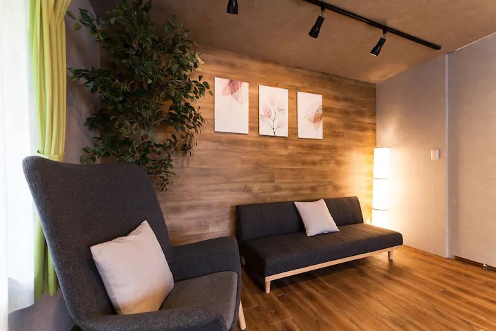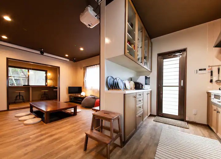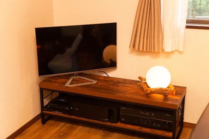 リビングには、5.1チャンネルスピーカー、Blu-rayプレイヤー、大画面プロジェクターを備えており、NETFLIX、YouTubeなどを楽しめます。