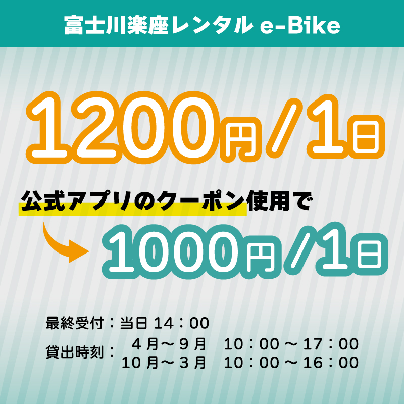 富士川楽座の公式アプリをダウンロードしていただくと、登録1台につき自転車1台が200円引きの1,000円(税込)でご利用いただけます。ご来館時に富士川楽座公式アプリのクーポン画面をスタッフにご提示ください。