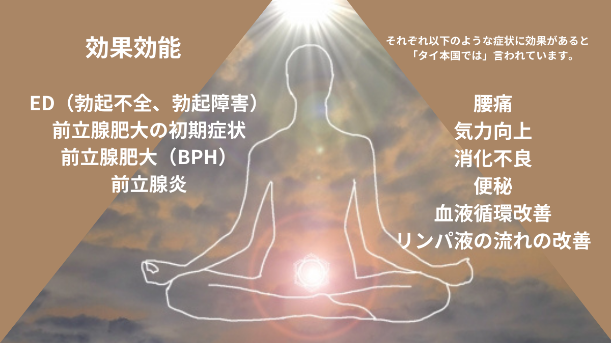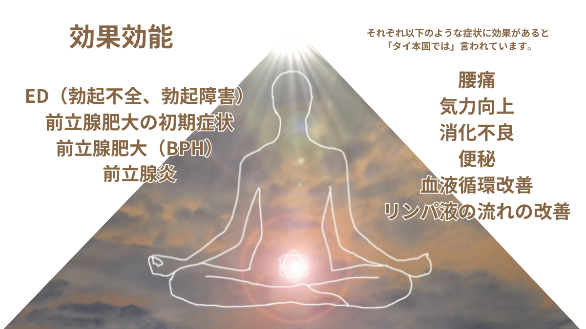 カルサイネイザンはホルモンバランスの調整に働きかける作用があり、気力向上、消化機能の向上、腰痛の軽減、内臓器官の向上、又、性的機能の回復や向上にも作用し、下記の様な効果・効能があると「タイ本国では言われています」(あくまで症状に対しての改善を目的としたセラピーです。効果効能をお約束する治療行為ではございません)。