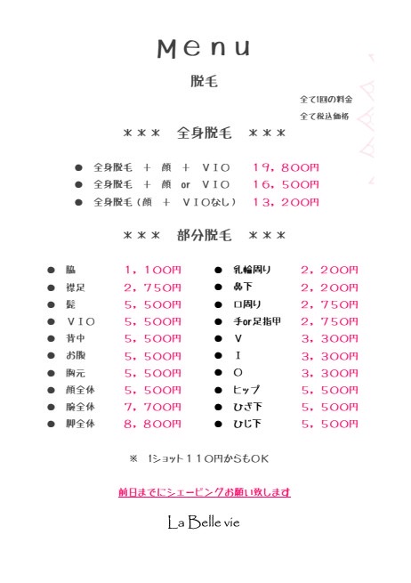髭・顔全体・背中・お腹・胸元・お尻・ひざ下・ひざ下・VIOから1箇所(既存の方) ¥5,500(税込)