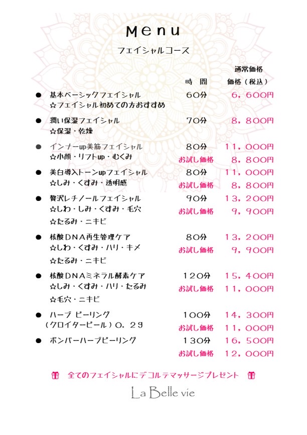 クレンジング→ウォッシング→ローション→ミネラル酵素パック(毛穴大掃除)→天然100%ハーブピーリング→美容液導入→核酸ボンバークリーム導入→美容液導入→栄養クリーム導入→栄養クリームパック導入→栄養導入パック→鎮静パック(クールダウン)→デコルテマッサージ→お仕上げ。