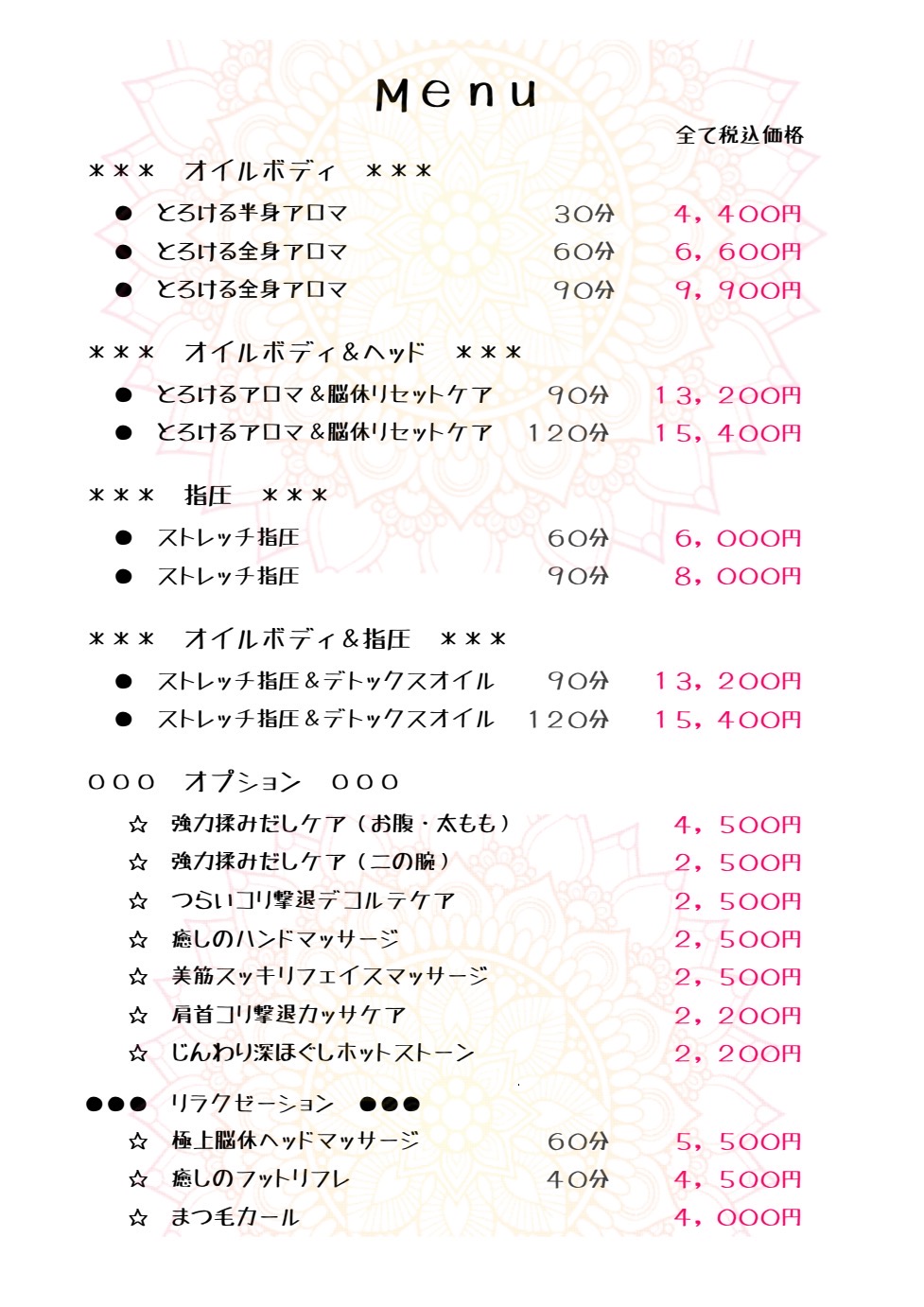 フェイシャル/ボディ/リラクゼーション/