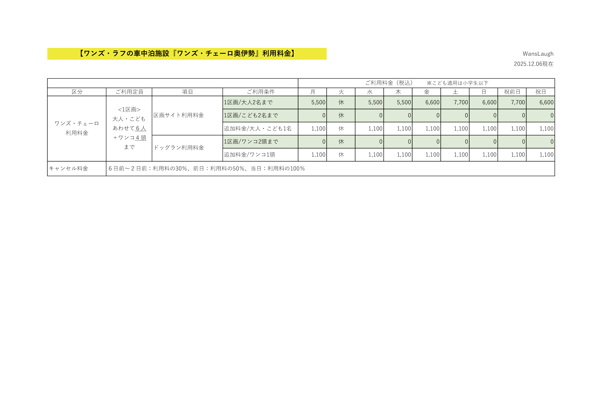 ※大人2名+こども(小6まで)2名+ワンコ2頭までサイト利用料金に含みます。これを超える場合は追加料金にて利用可能