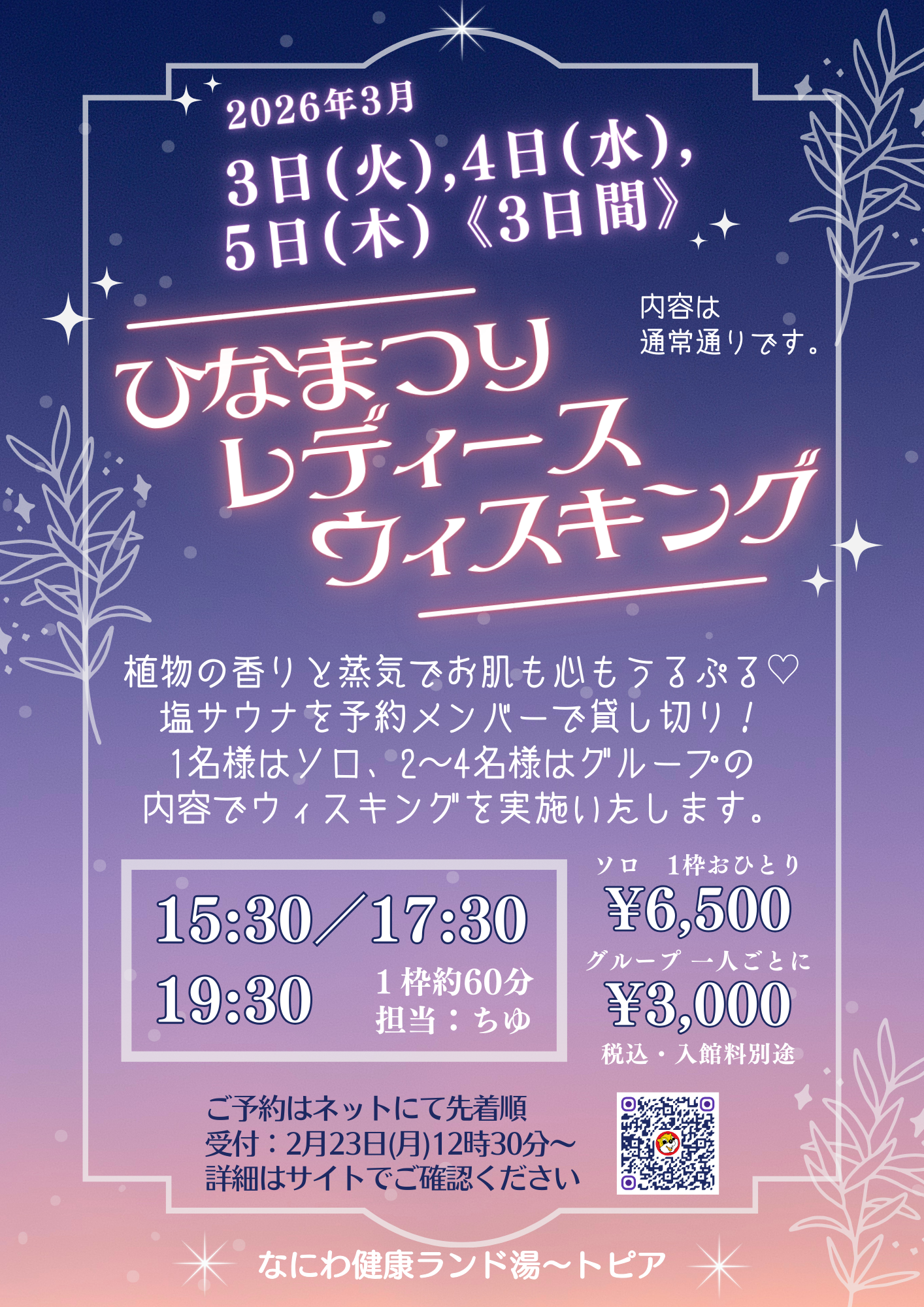 3月女性向けウィスキングは、2月23日(月・祝)12時30分頃受付開始です。(手動で切り替えるため多少誤差が発生する可能性がございます。)