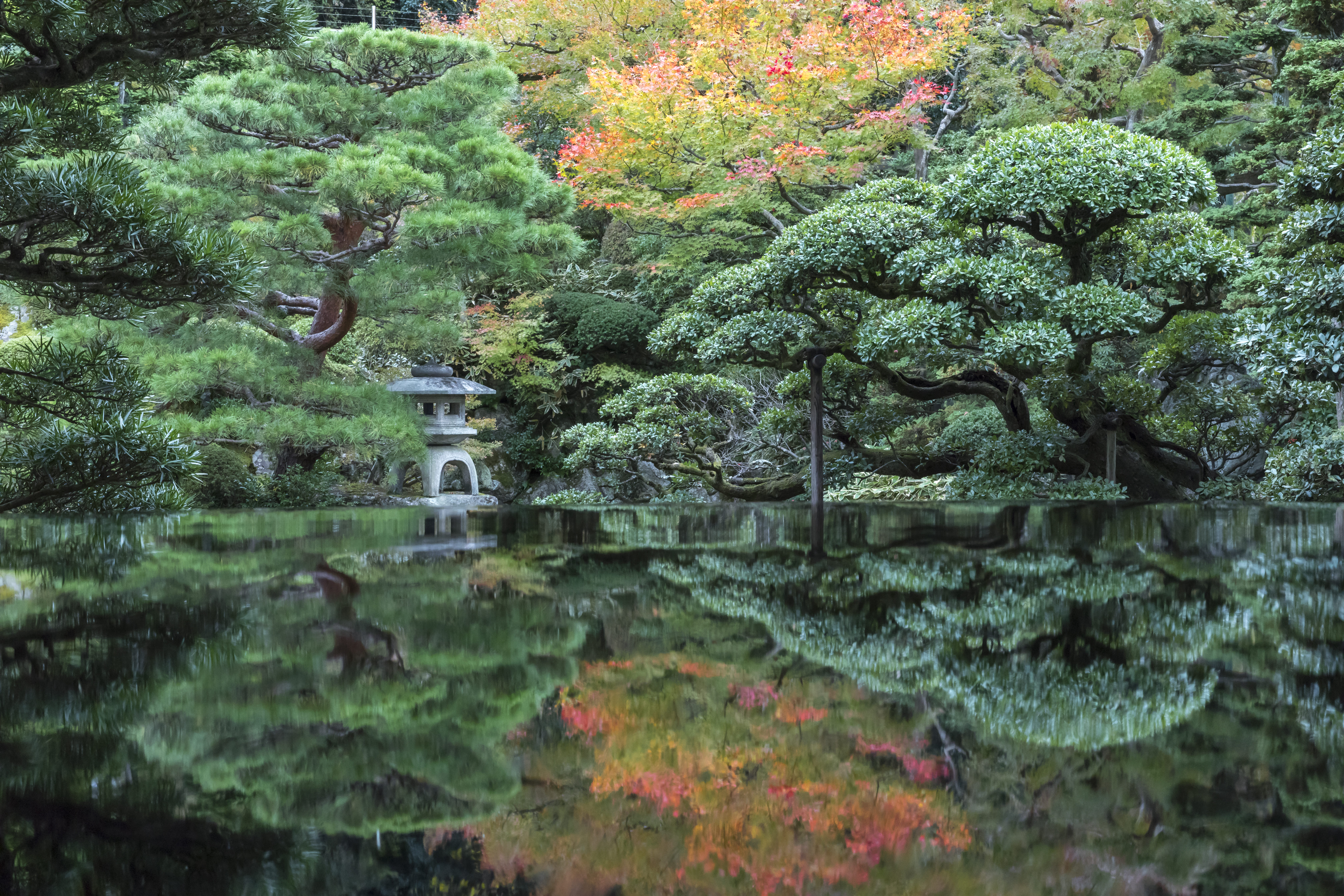 常緑樹の中の紅葉は、緑と赤のコントラストの庭園を「事前予約」「10名限定」で館長が皆様をご案内させていただきます。お茶とお菓子を召し上がりながら、特別な空間をゆったりとご観賞ください。