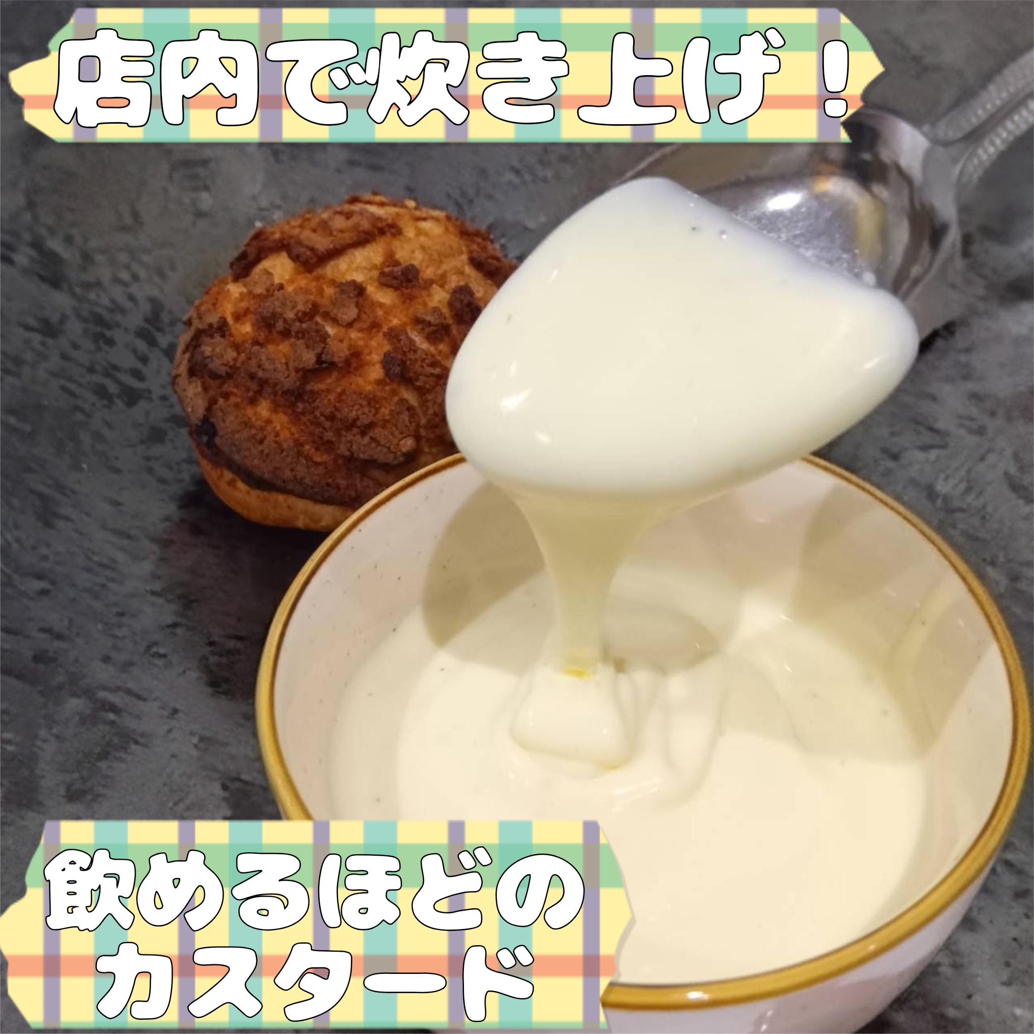 当店のかき氷で評価の高いカスタードは無限とも飲めるとも言われて続けておりますがこれを更にシュークリーム用にアレンジしました。