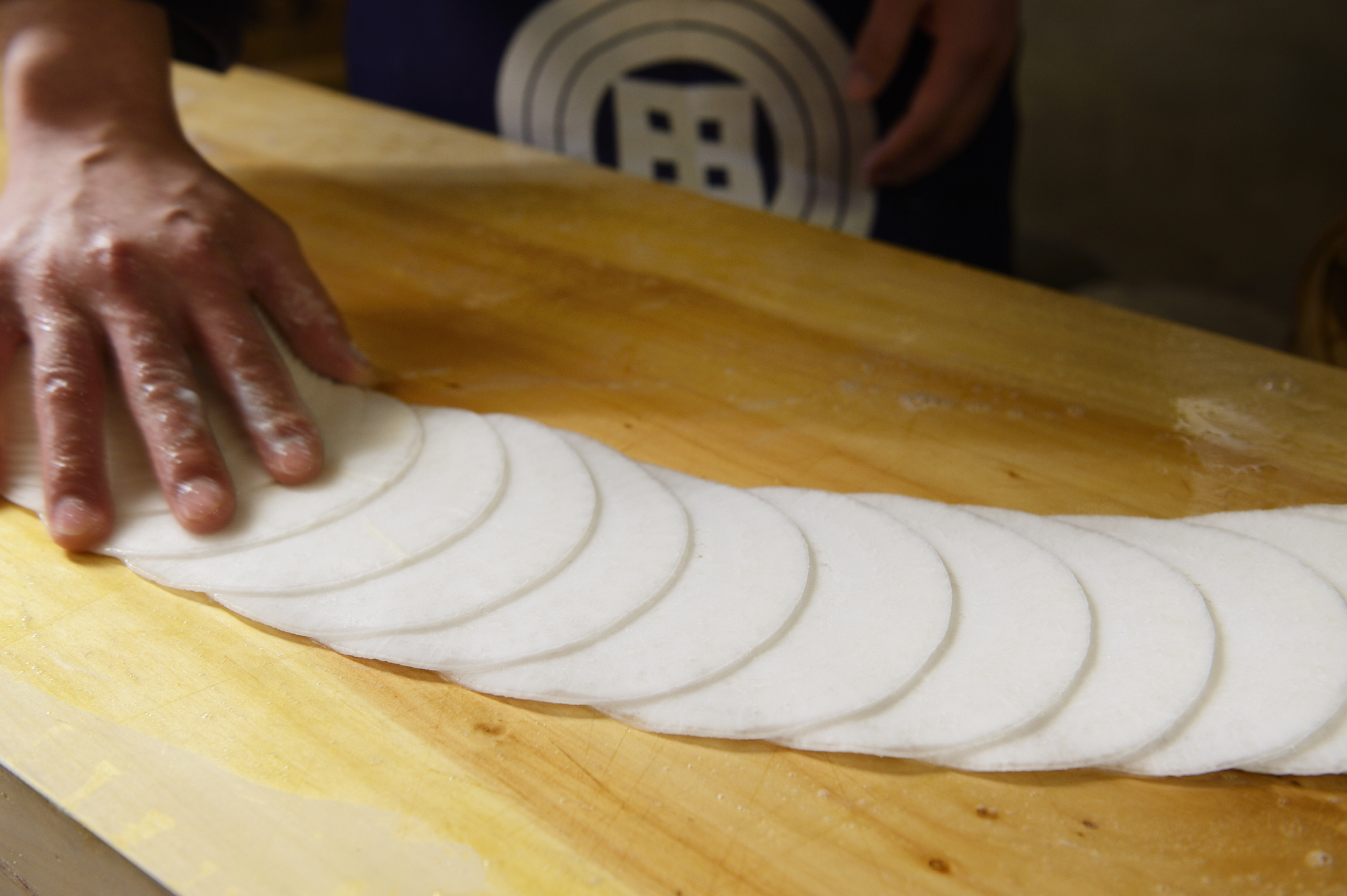 京野菜の「聖護院かぶら」を「シュッ、シュッ」と音を響かせながら、専用のカンナで薄く削り、大きなまな板の上に、トランプのように広げ、樽に敷き詰めていく職人の技をご覧いただきます。
