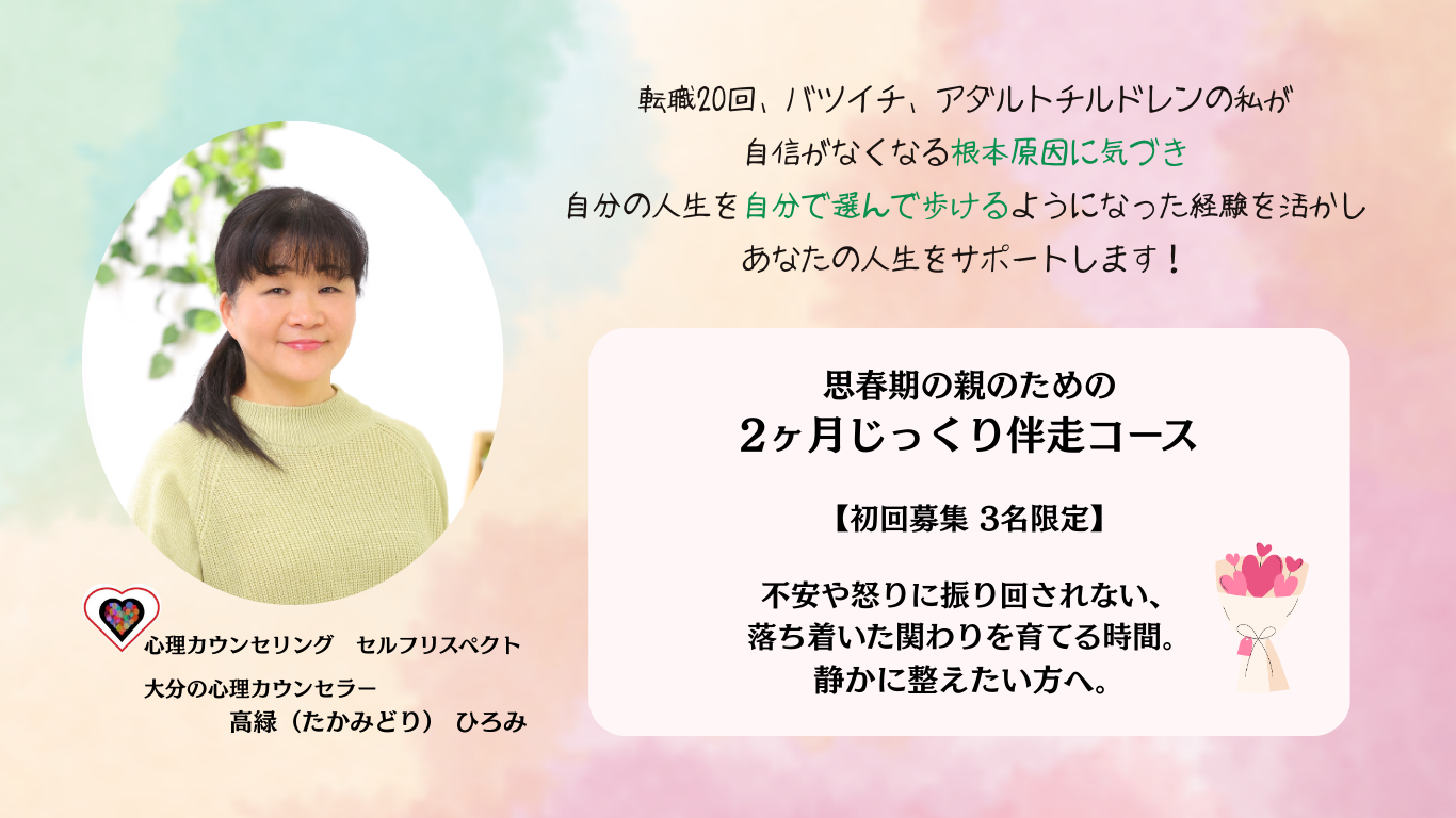 思春期の親のための 2ヶ月じっくり伴走コース【対面カウンセリング60分】の予約ページです。