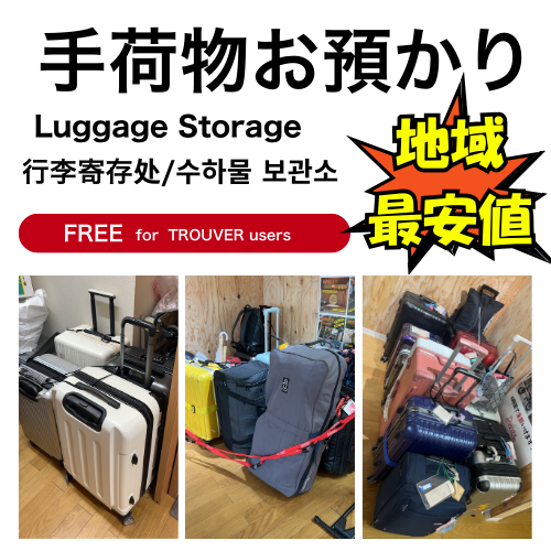 お手荷物お預かりサービスのみご利用の場合はこちら。 サイズ制限なく、お手荷物1つにつき500円をいただきます。 17時までは延長料金はかからずお預かりいたします。 17時〜18時まではお手荷物1つにつき延長料金として250円をいただきます。