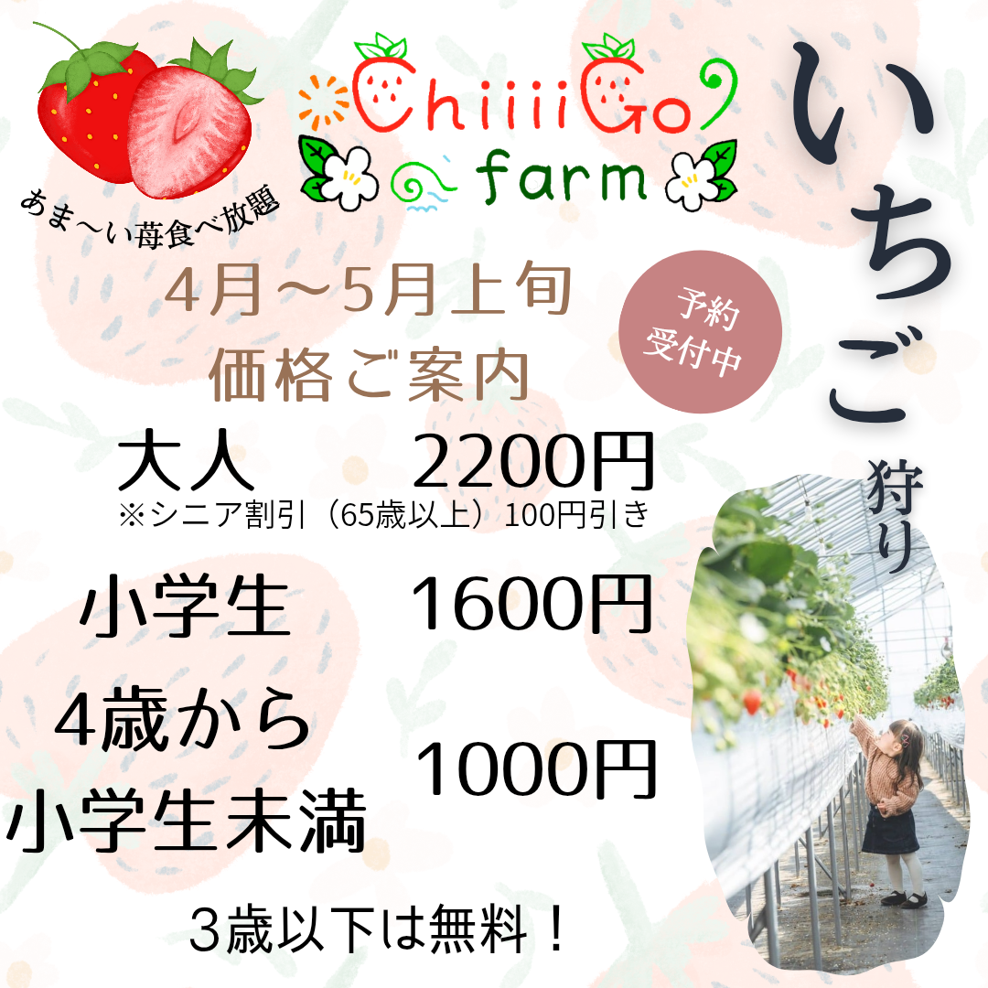 いちご狩りは予約制です。事前に予約をお願いします。予約確認メールが届かない場合はお問い合わせください。キャンセル・変更についてキャンセルは前日まで無料です。当日のキャンセルはキャンセル料として代金の70パーセントをいただきます。変更は空き状況により対応しますので早めにご連絡ください。当日は動きやすい服装・靴でお越しください。雨天時は足元にご注意ください。熟していないいちごは摘み取らないでください。(無断持ち帰り禁止)。飲酒やペット同伴での入場は禁止です。事故や体調不良時は速やかにスタッフにご連絡ください。
