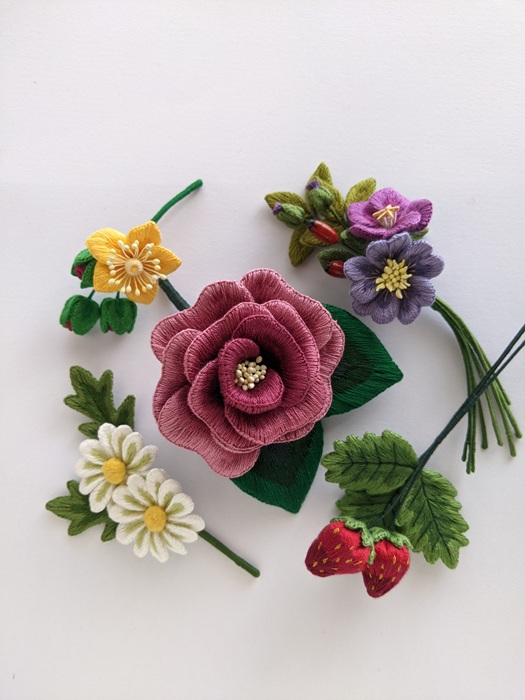 実は写真の作品、手芸屋さんで売ってる材料と基本的な刺繍ステッチだけで作っています。作家PieniSieni考案のオリジナル技法で、立体的でボリュームのあるお花を作りませんか?