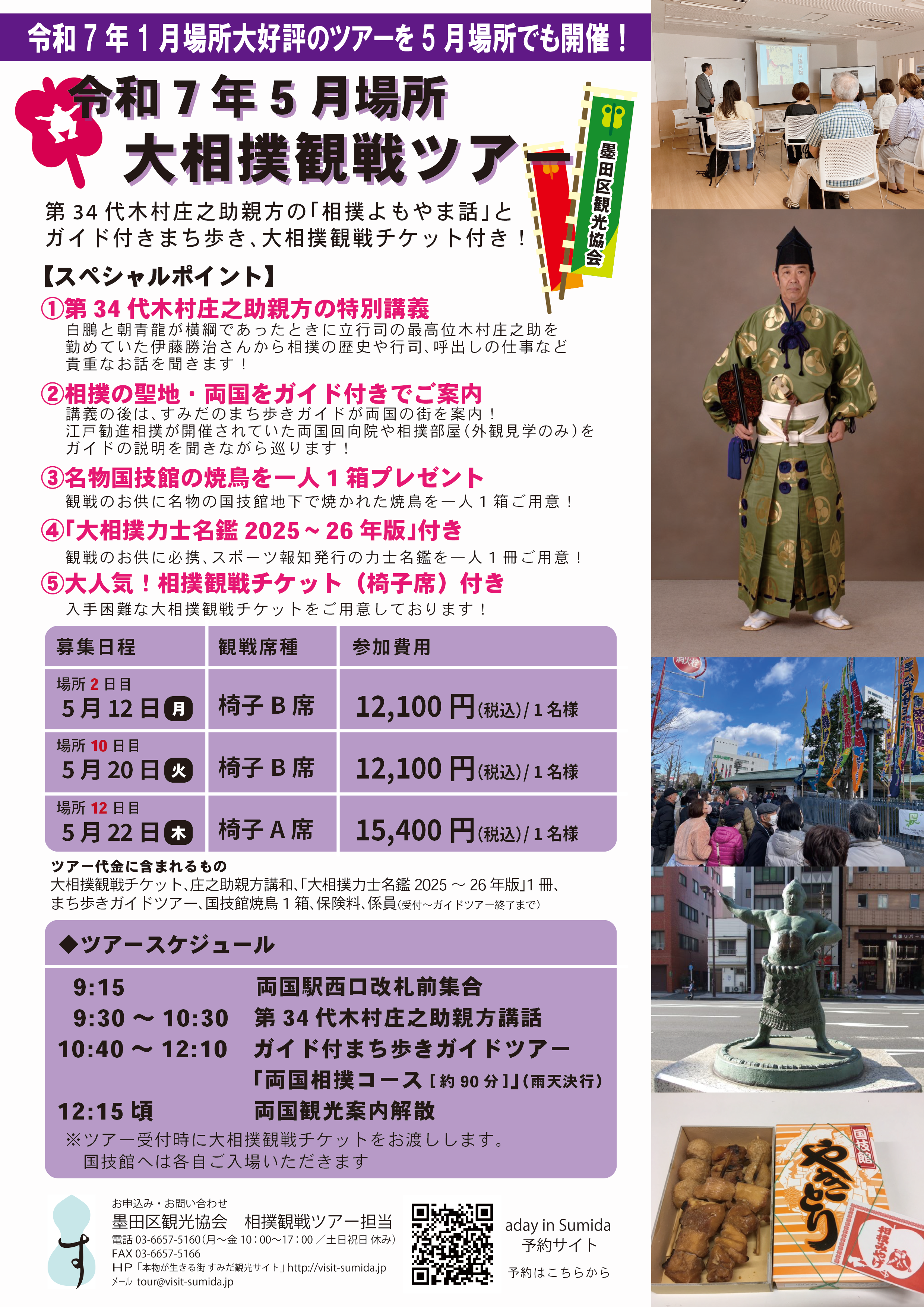 元立行司の親方のお話や両国のまち歩きガイドツアー、名物の焼鳥も付いた”相撲の街すみだ”にふさわしいボリューム満点、特別な相撲観戦ツアーです!!