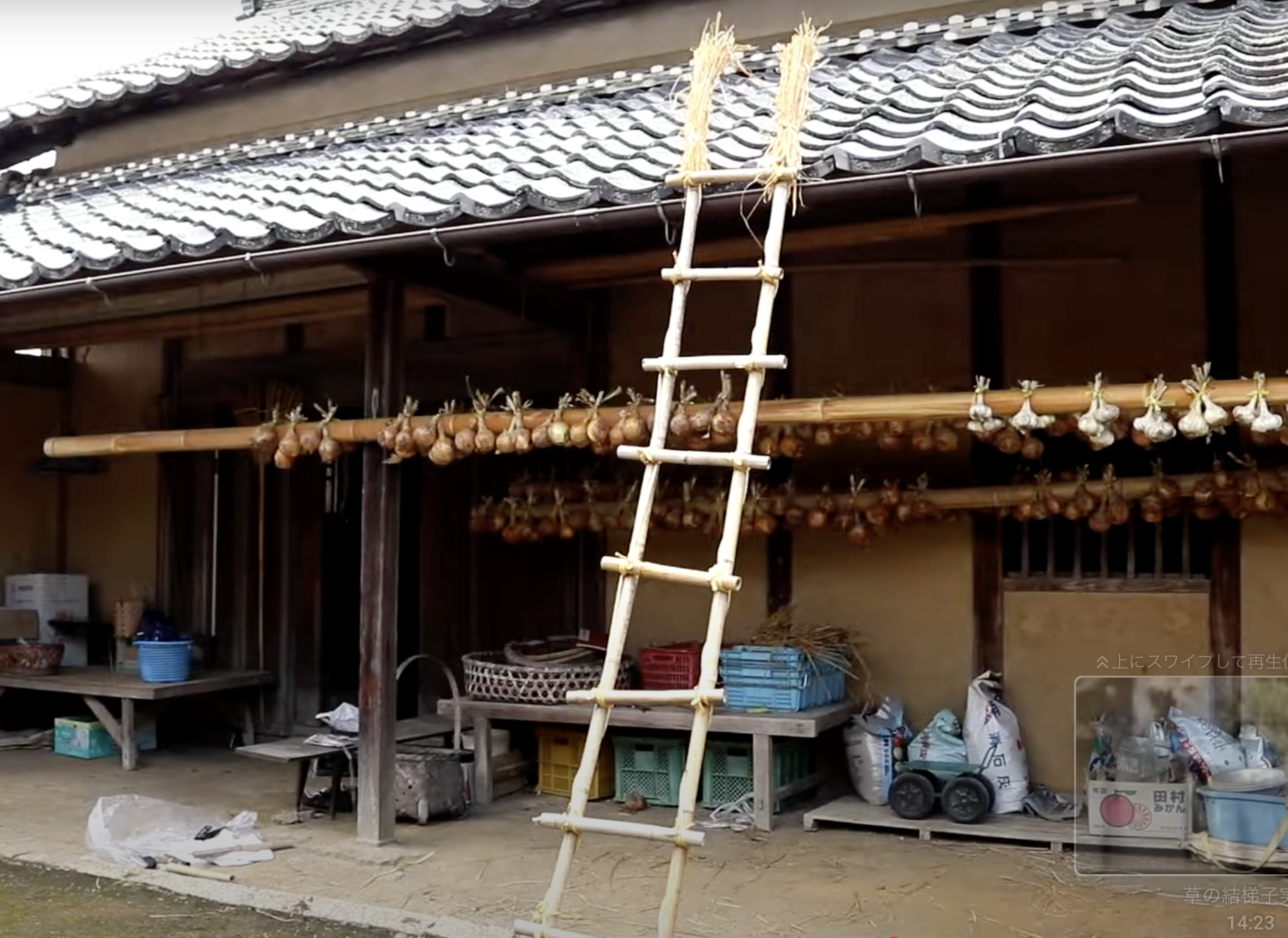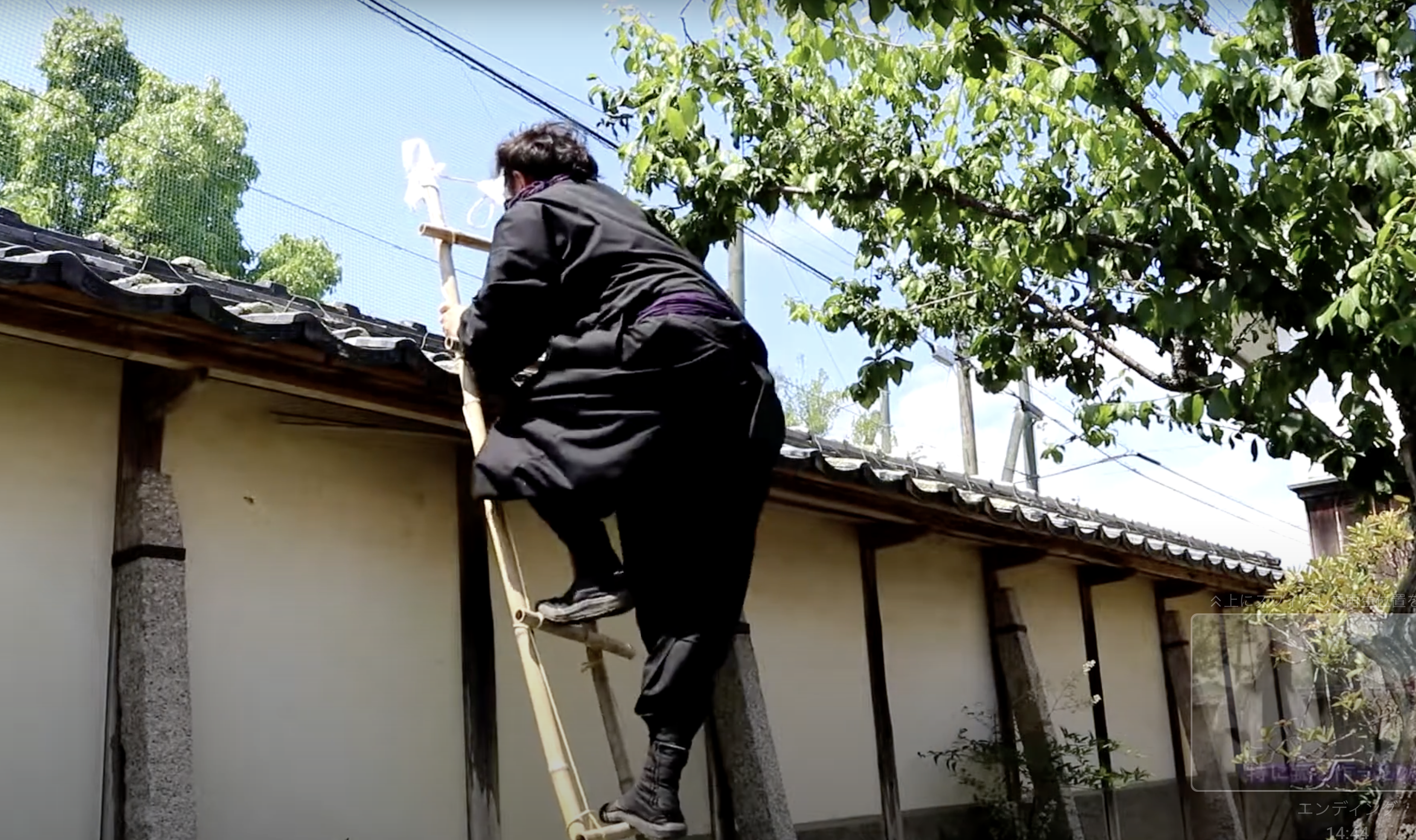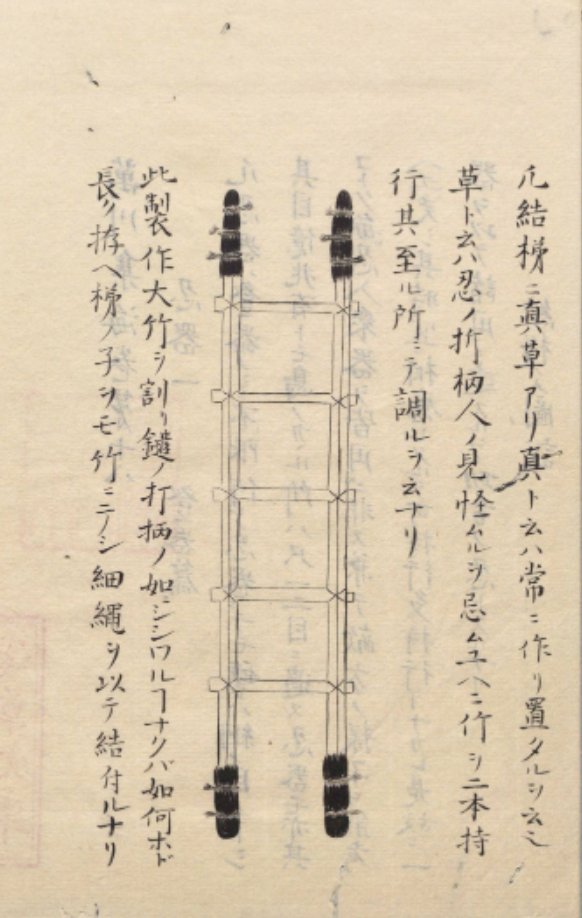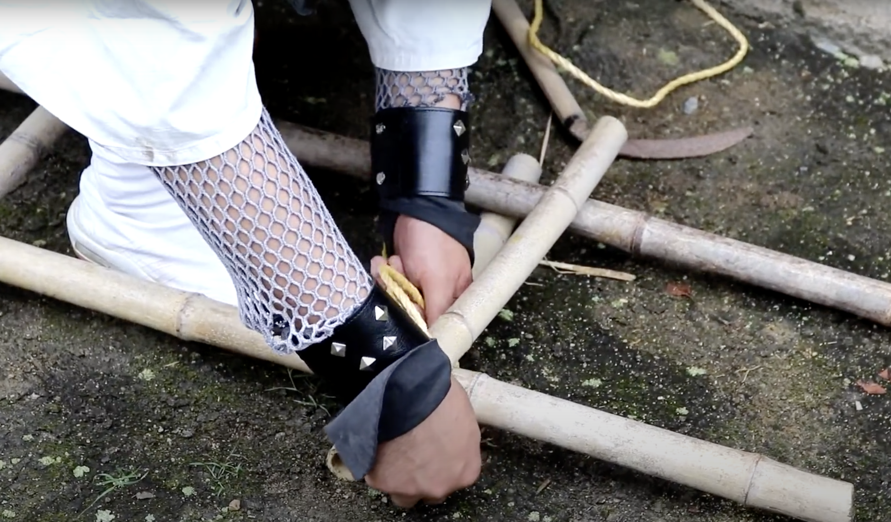 忍術書『万川集海』に記された高い塀や壁を登るための結梯子を自作するワークショップ。竹を組んで縄で縛り、自分の背丈より高い梯子を組んでいきます。完成後は昇降ができるかどうか実践しましょう!