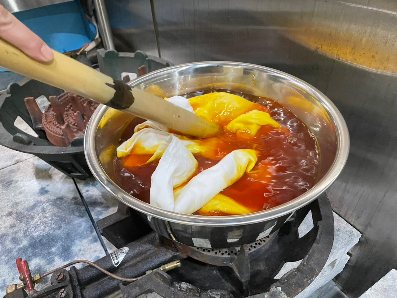 西陣の町家カフェ「カフェ・フロッシュ」で、お茶菓子と飲み物を楽しみながら染色についてレクチャー。西陣の街並みや千本釈迦堂を楽しみながら「稲垣機料」へ移動。機織り機や道具を見学のあと、自然染料を使った草木染めや糸車を使った糸紡ぎを体験。完成したオリジナルエコバッグ、紡いだ糸はお持ち帰りいただきます。