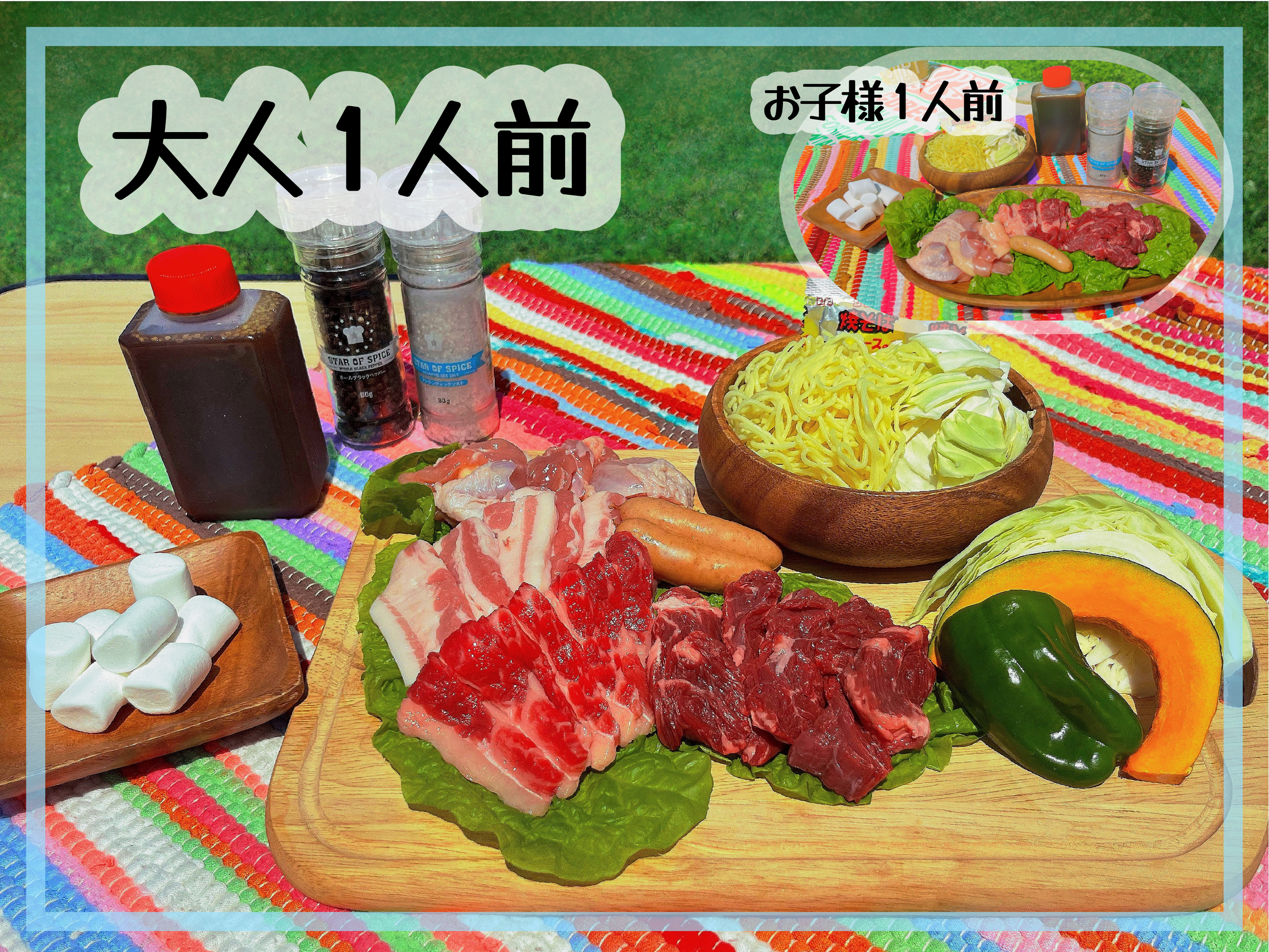 牛ハラミ50g、豚バラ50g、若鶏50g、フランクフルト1本、焼きそば(半玉)、焼き野菜(2種)、マシュマロ(適量)、焼肉のタレ、塩コショウ