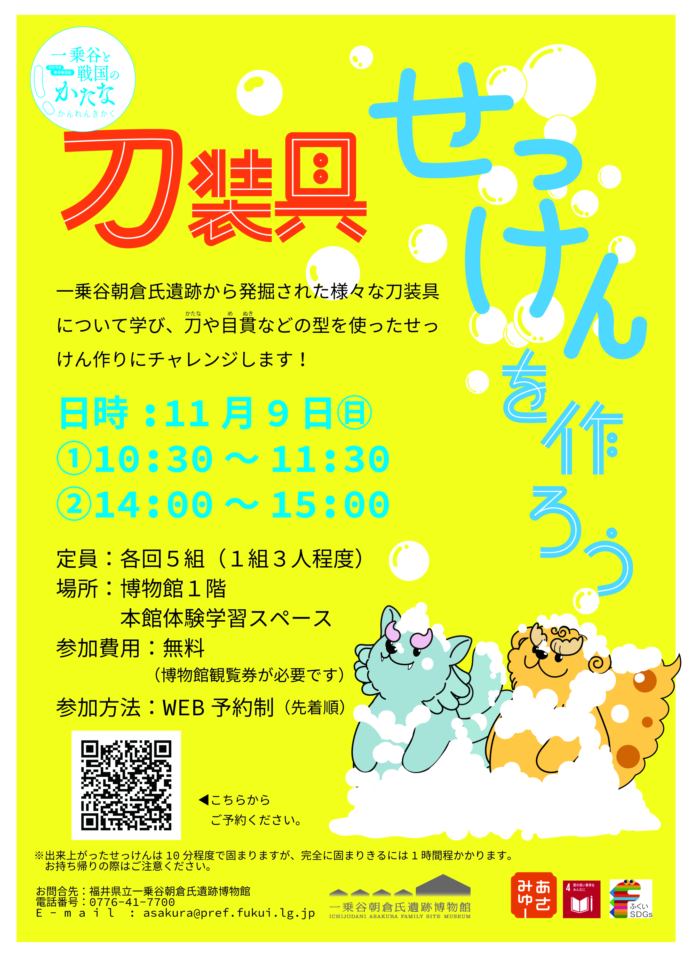 一乗谷朝倉氏遺跡から発掘された様々な刀装具について学び、刀や目貫などの型を使ったせっけん作りにチャレンジします!