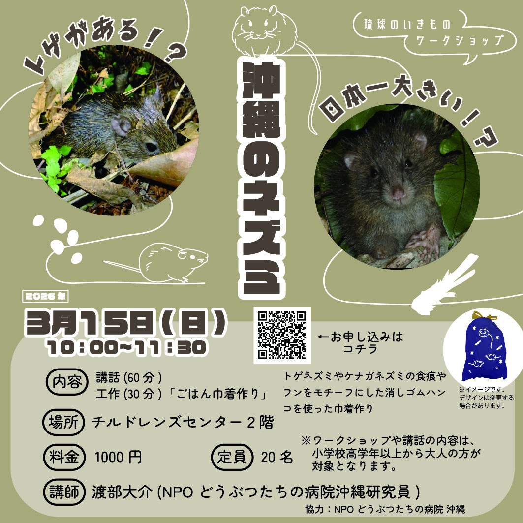 琉球弧にくらすいきものたちについて学ぶワークショップを開催します。今回は、沖縄に生息する固有種のトゲネズミと、日本最大のネズミであるケナガネズミをテーマに実施します。講師が関わってきたトゲネズミの生息域外保全の取り組みをはじめ、野生下での生態・行動・食性、個体数減少の背景、そして現在の保全活動について紹介します。ワークショップでは、トゲネズミやケナガネズミの食痕やフンをモチーフにした消しゴムハンコを使った体験を行います。フィールドサイン(痕跡)から野生動物のくらしを学ぶ「ごはん巾着作り」を通して、楽しみながら理解を深めていただきます。