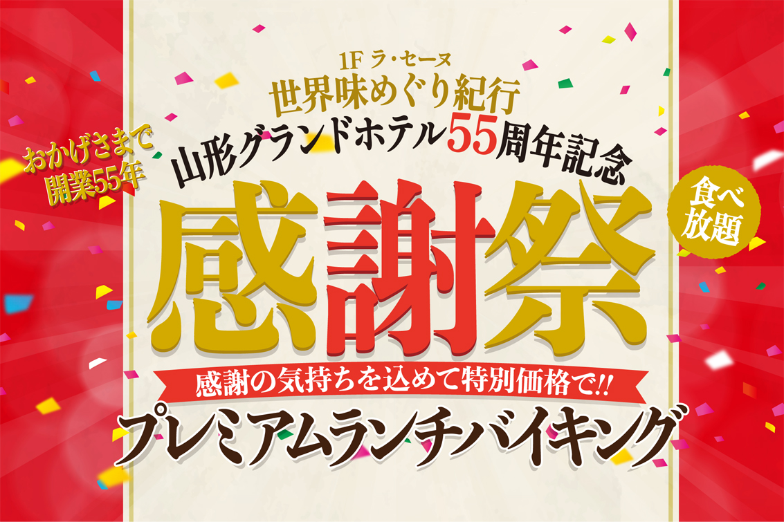 「ラ・セーヌ」では、山形グランドホテル開業55周年記念として“感謝祭プレミアムランチバイキング”を開催いたします。選りすぐった世界のグルメを特別価格でご提供いたします。