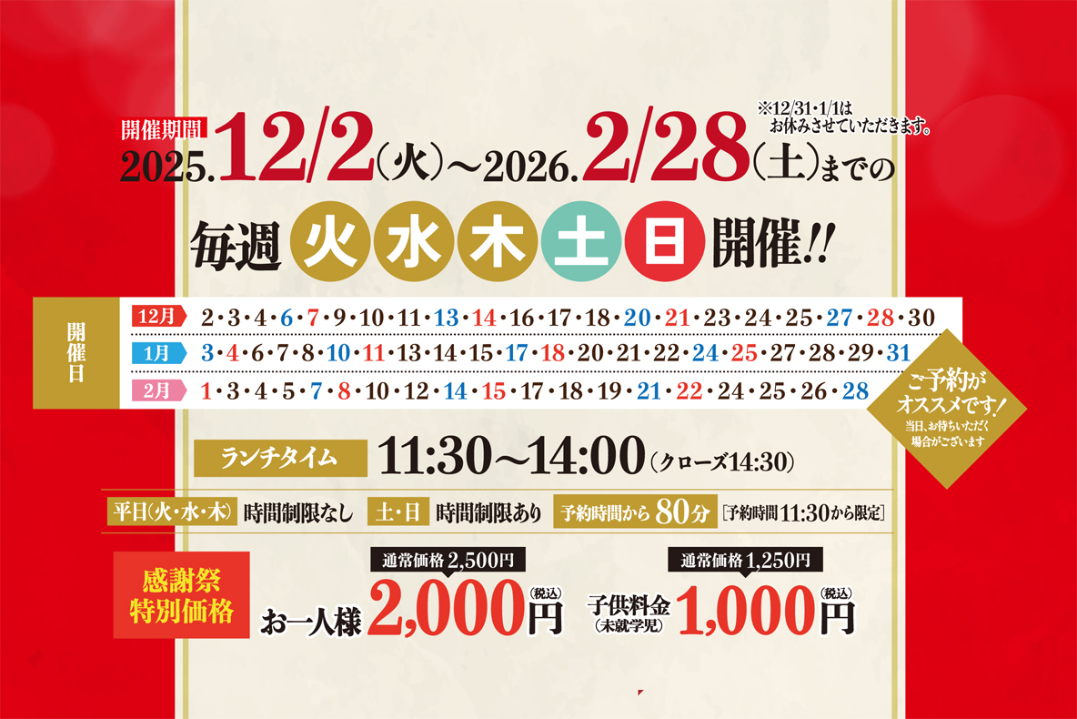12月6日から 感謝祭プレミアムランチバイキング 土曜・日曜