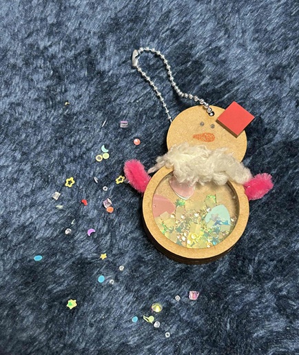 木の雪だるましゃかしゃかキーホルダーをつくります。ツリーに飾ってもよし、お気に入りのカバンにつけてもよし。