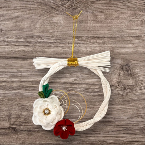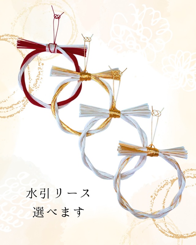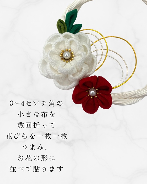 水引リースのお正月飾りを作ります。水引教室も開催している講師が作ったリースに、つまみ細工のお花を飾ります。お花は、大きめのお花一輪と、小花二輪(小花と葉をひとつずつも可)です。直径11センチほどの小さめで飾りやすいサイズです。