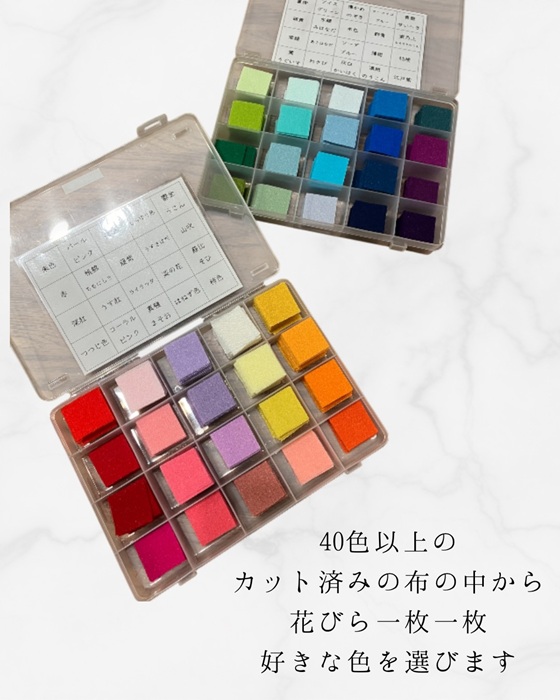 40色以上のカット済みの布から、花びら一枚一枚好きな色を選びます。