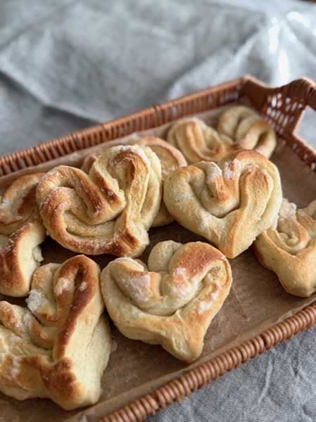パン生地にバターとお砂糖であまーいハートに仕上げていきます!どうしたらかわいいハートになるでしょう?作り方覚えたらお家でも作ってみましょう。お持ち帰り生地でしっかり復習もできますよ!