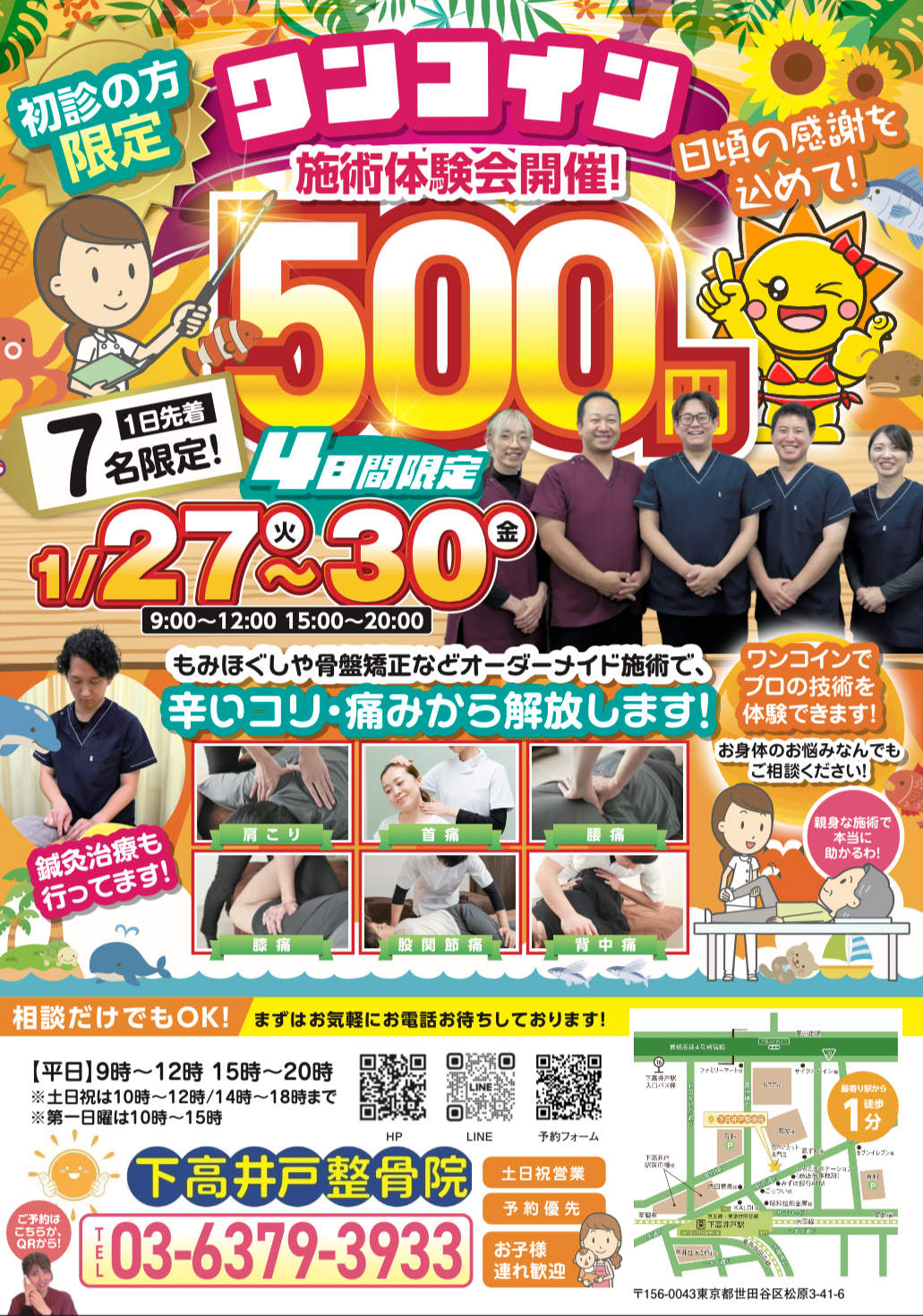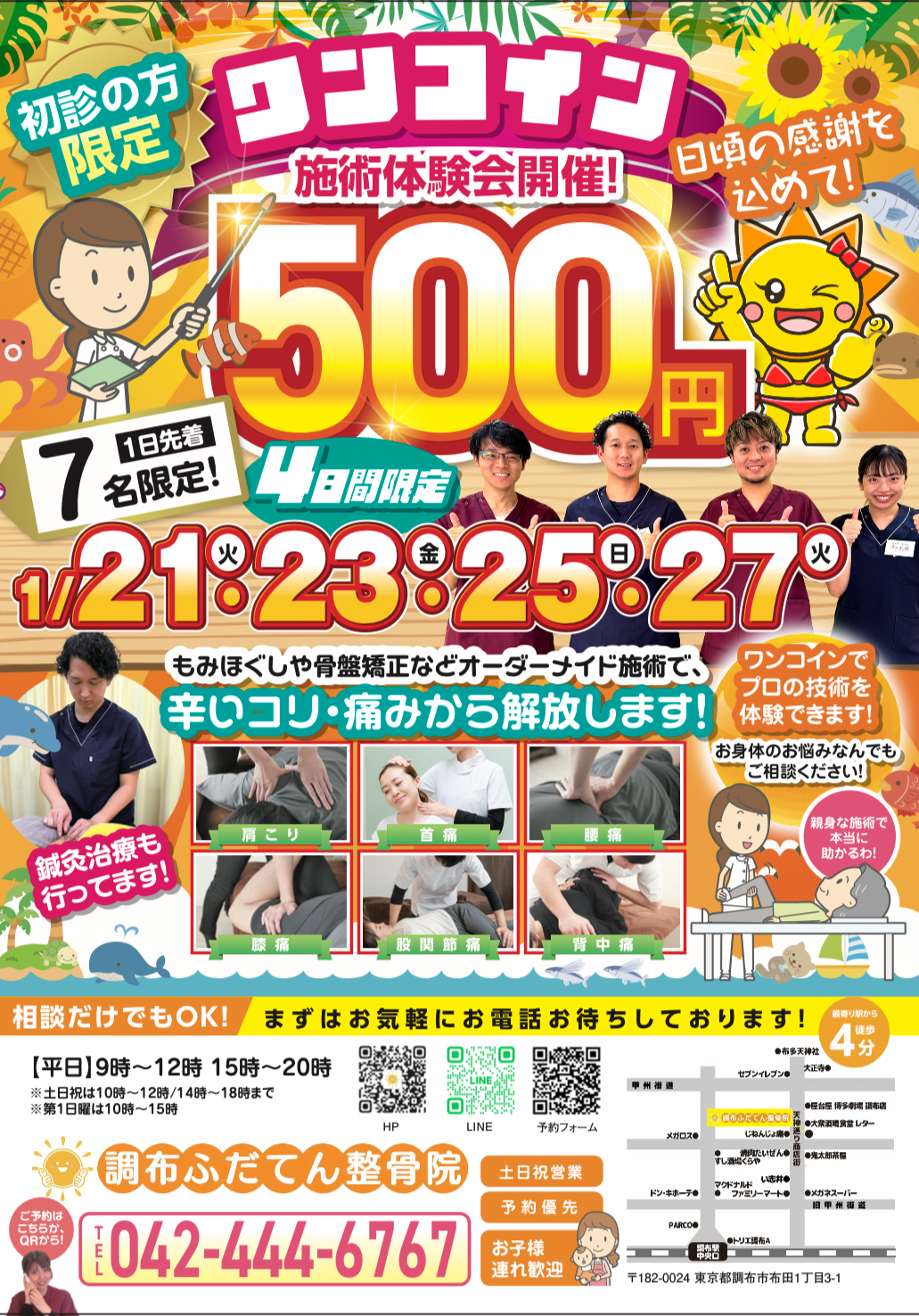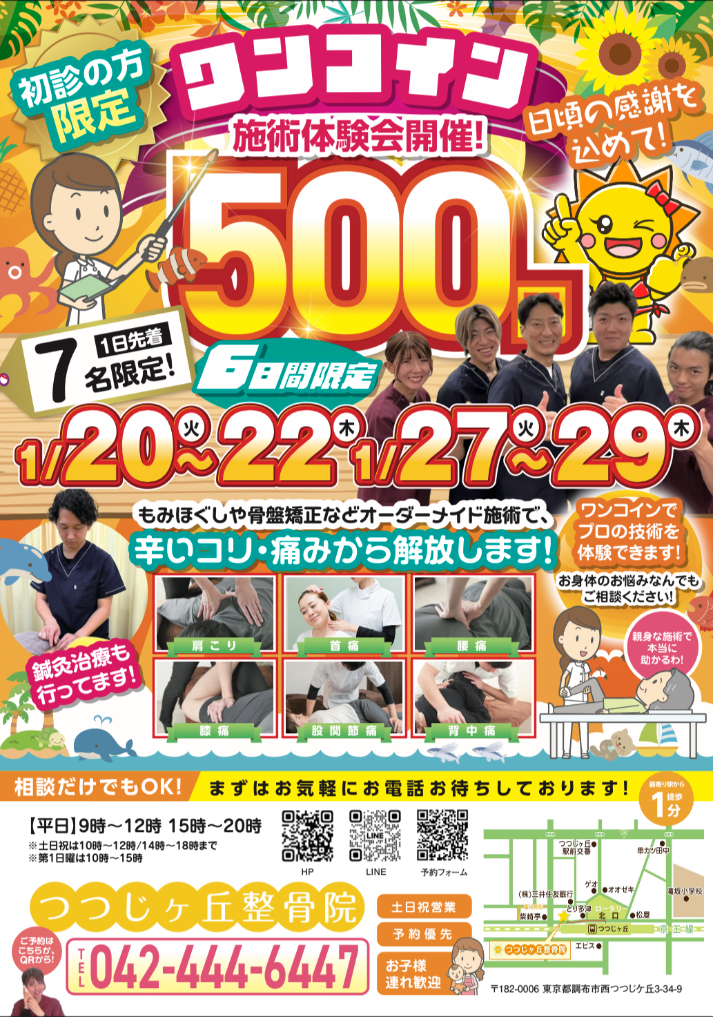 2026年1月 27日(火)・28日(水)・29日(木)・30日(金) 4日間限定! ワンコイン施術体験会を実施いたします! 1日先着7名となりますのでお早めにご予約ください! 当院の治療技術をこの機会にぜひお試しください!
