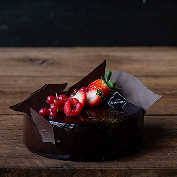 ヴァローナのイランカを使ったショコラムースとなめらかなバニラムースを合わせ、華やかに赤いベリーでデコレーションします