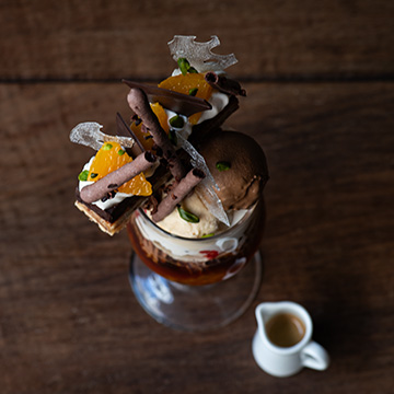 オレンジのキャラメリゼに、濃厚なアールグレイ香るショコラガナッシュと、トンカ豆のシャンティ、コーヒーブランマンジェを重ねました。