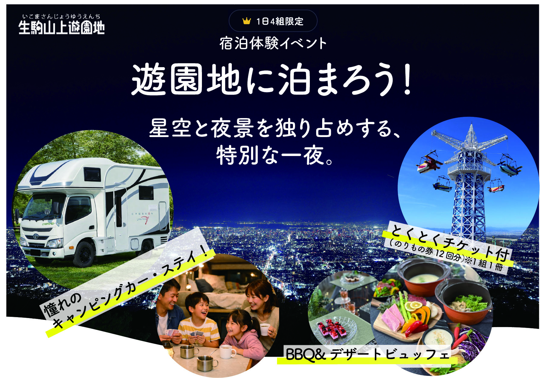 生駒山上遊園地【PLAY PEAK ITADAKI】エリアに設置したキャンピングカーで遊園地に泊まる、宿泊体験イベントです。