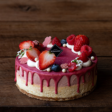 なめらかなベイクドチーズケーキに赤いベリーと桜のムースをあわせたケーキ。ピンクのグラサージュでかわいらしく仕上げます。
