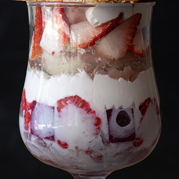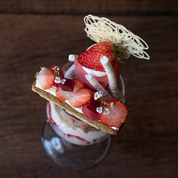 仕上げに、ココナッツミルクアイスと苺のソルベを添え、ミルキーなコクと甘酸っぱい果実の味わいが重なり合う、贅沢なパルフェです。