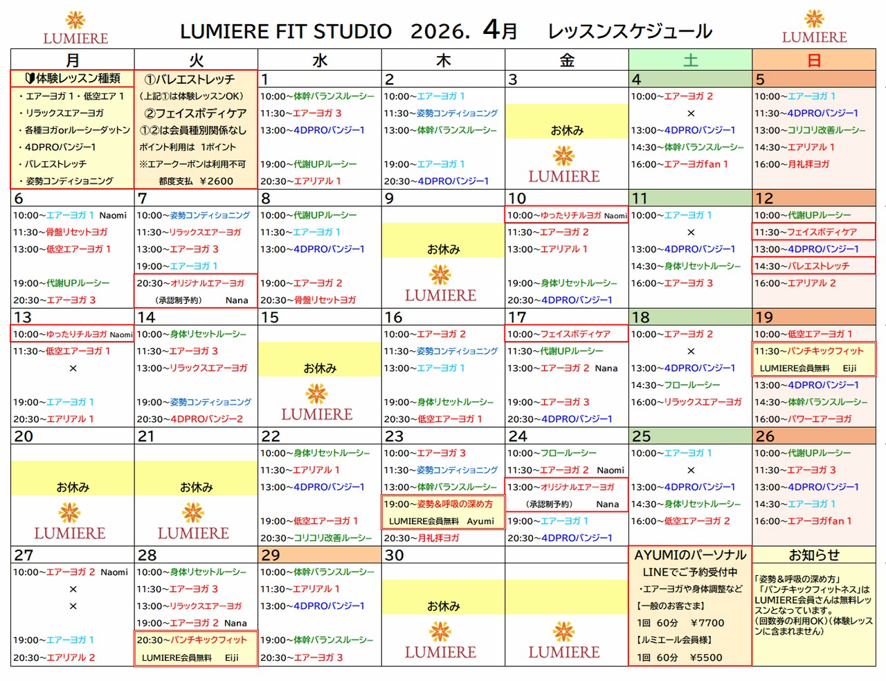 ☆フロア・エアーヨガはAYUMI以外のインストラクターも担当します。