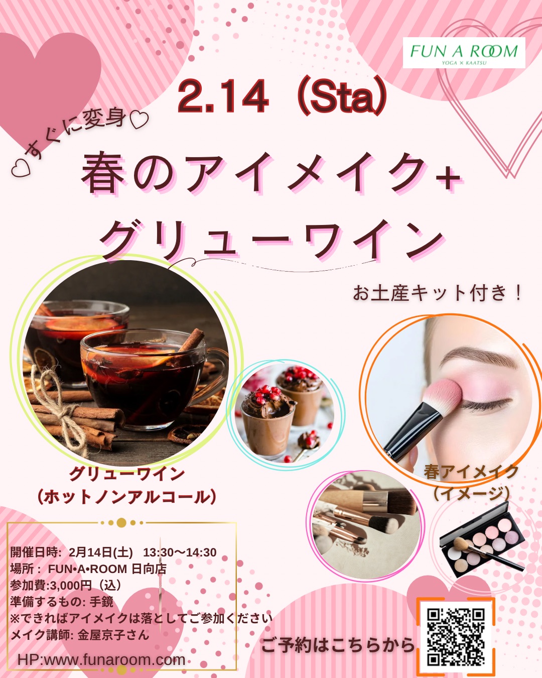 先取りで春のアイメイクをプロのメイク講師さんから教えてもらいます✨メイクの後は、バレンタインの時期にピッタリ!グリューワイン(ホットノンアルコール)で皆さんと楽しい時間を過ごせればと考えています♫ 嬉しいおみやげキット付きです☆