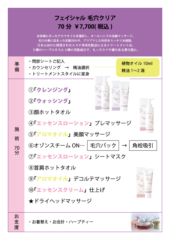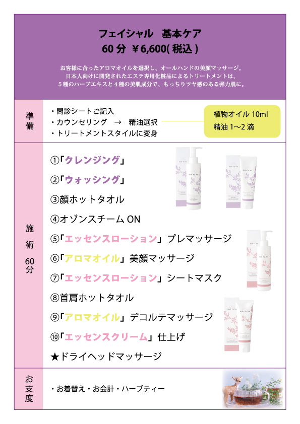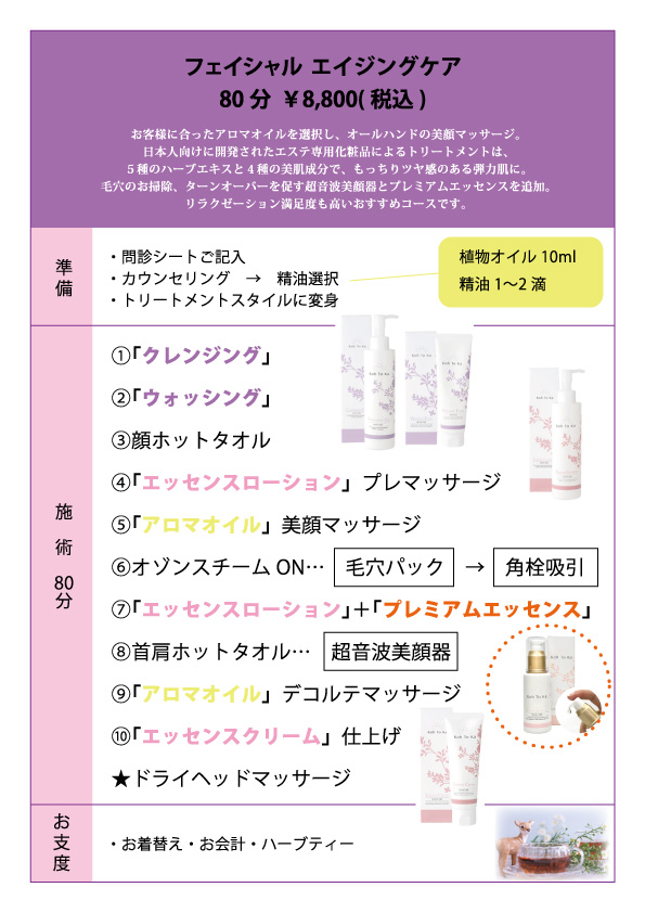 クレンジング→ウォッシング→ホットタオル→アロマinオゾンスチーム→オールハンドマッサージ(顔デコルテ首肩頭)→フェイスパック→保湿仕上げ+ハーブティー