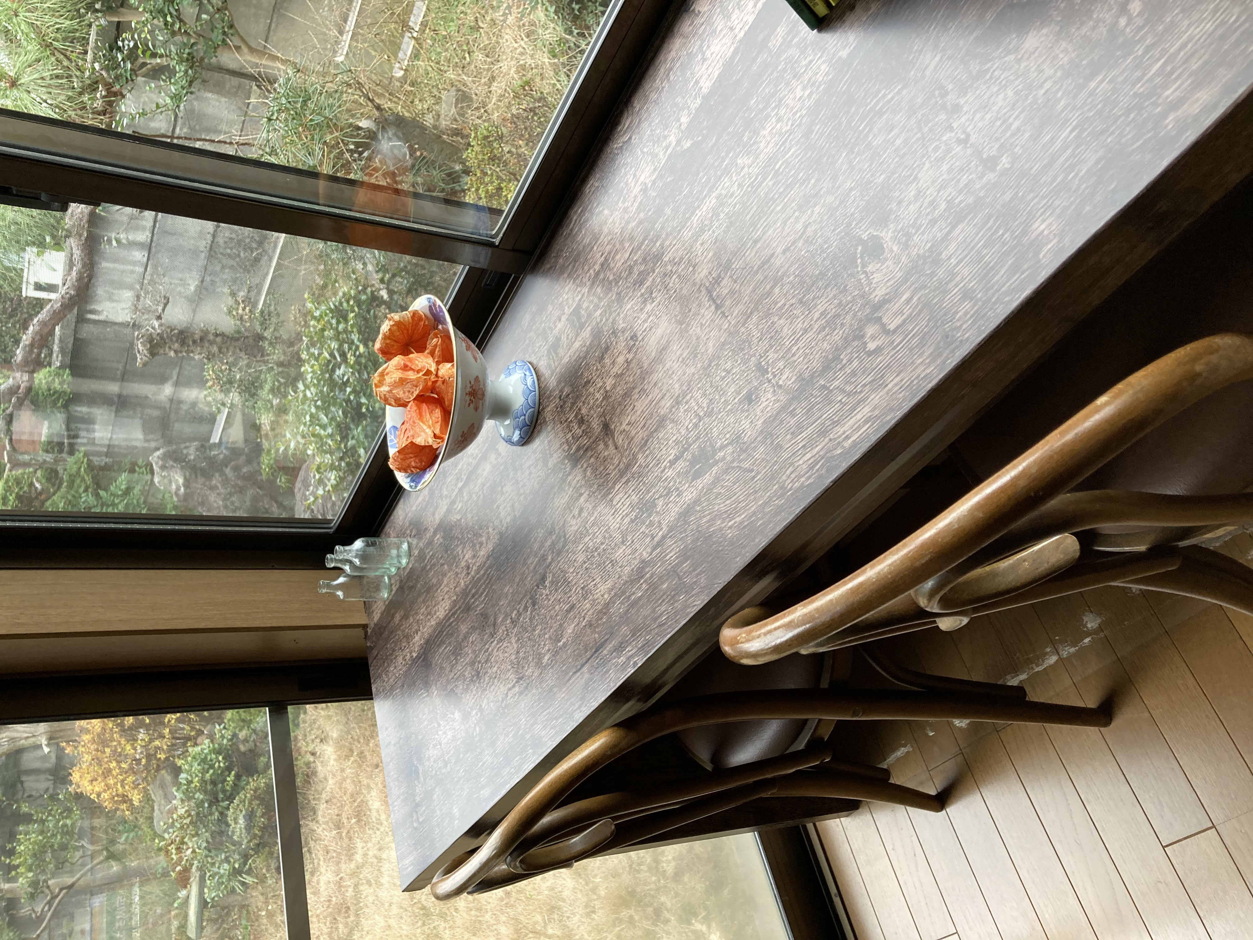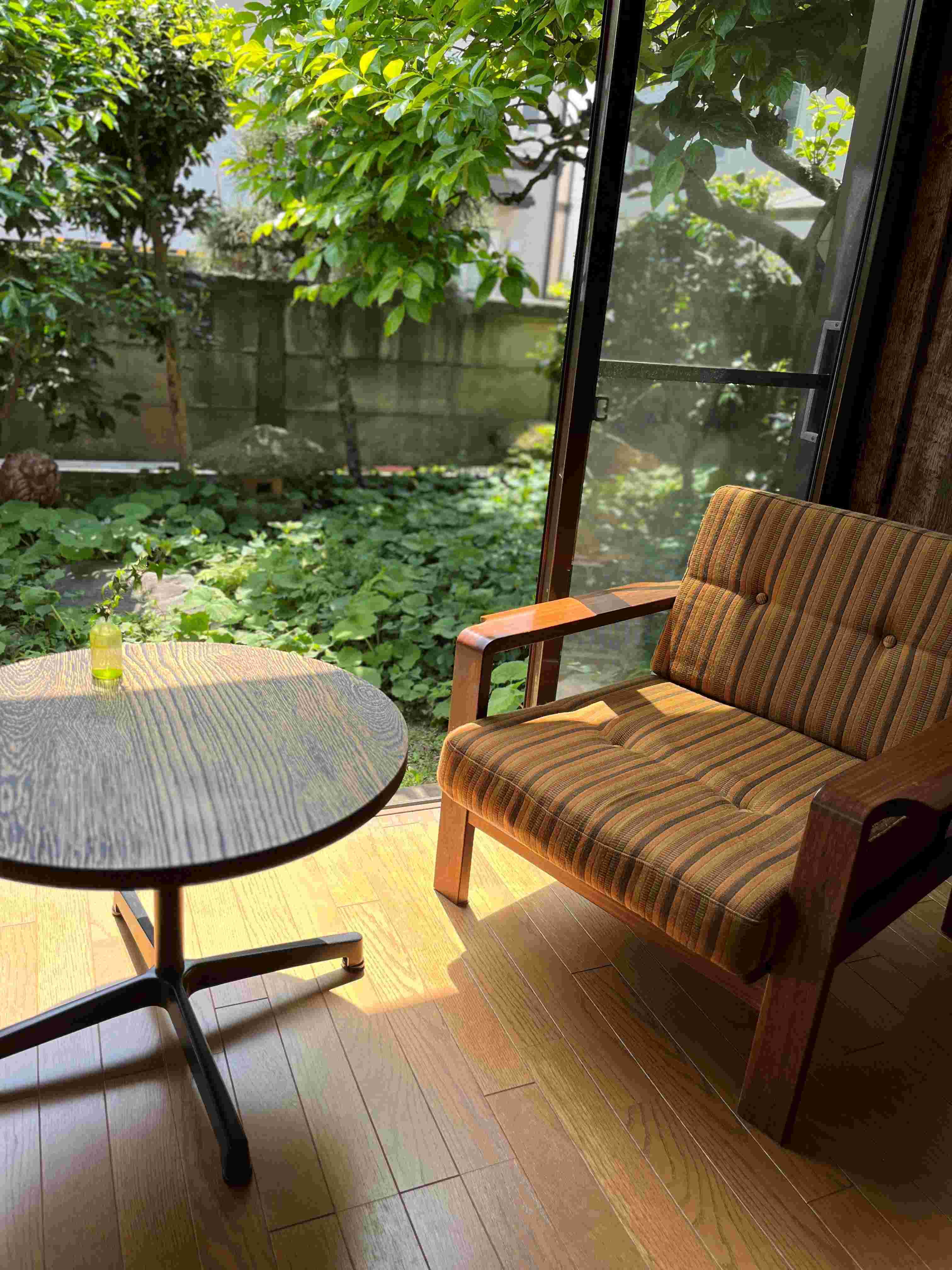 窓際のお庭で飼っている(?!)ライオンの正面の席です。大きな一人用のソファーでゆったりと一人の時間を味わいたい方向け。